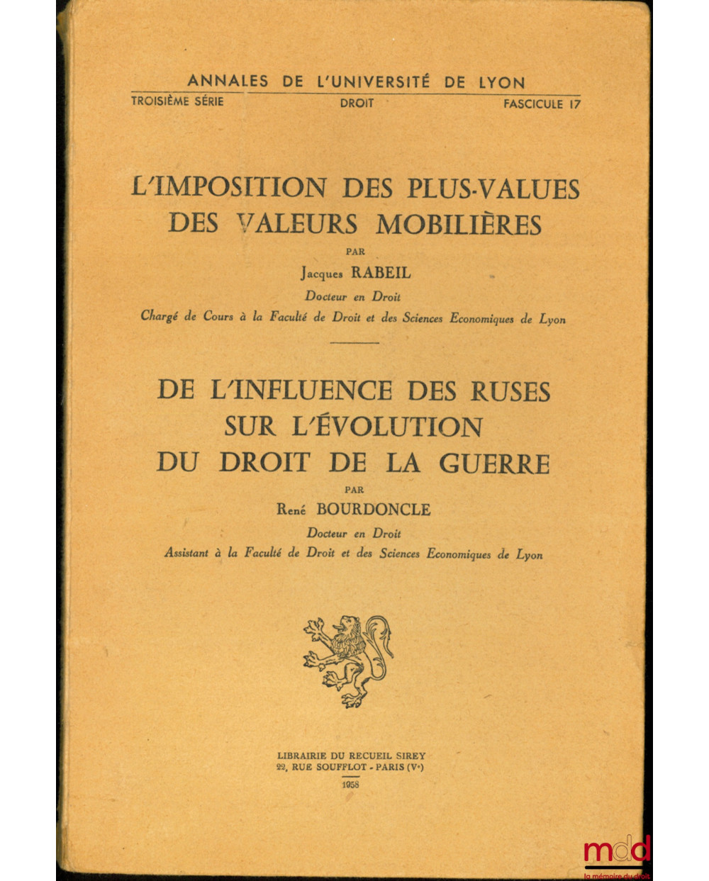 L’IMPOSITION DES PLUS-VALUES DES VALEURS MOBILIÈRES par J. Rabeil - DE L’INFLUENCE DES RUSES SUR L’ÉVOLUTION DU DROIT DE LA GUERRE par R. Bourdoncle. Annales de l’Université de Lyon, 3ème série, Droit, fasc. 17