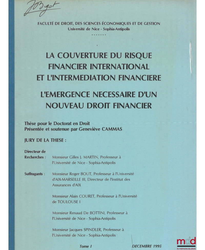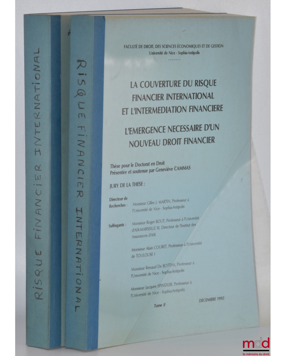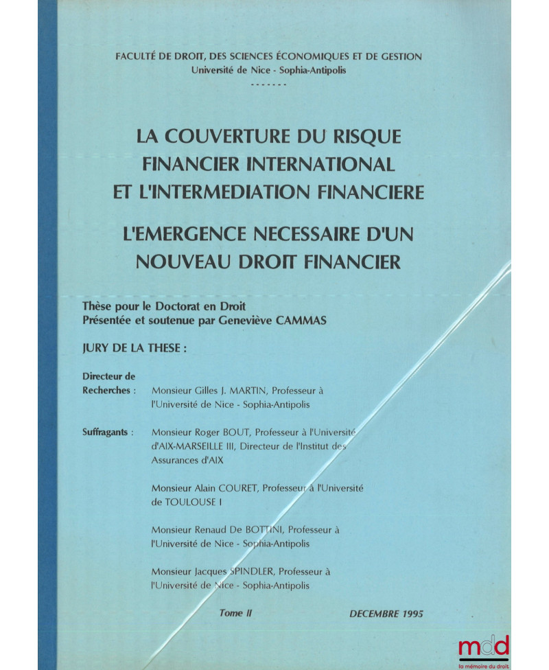 LA COUVERTURE DU RISQUE FINANCIER INTERNATIONAL ET L’INTERMÉDIATION FINANCIÈRE, L’ÉMERGENCE NÉCESSAIRE D’UN NOUVEAU DROIT FINANCIER, t. I et II, Thèse (Gilles J. Martin, Roger Bout, Alain Couret, Renaud De Bottini, Jacques Spindler), Université de Nice - Sophia-Antipolis
