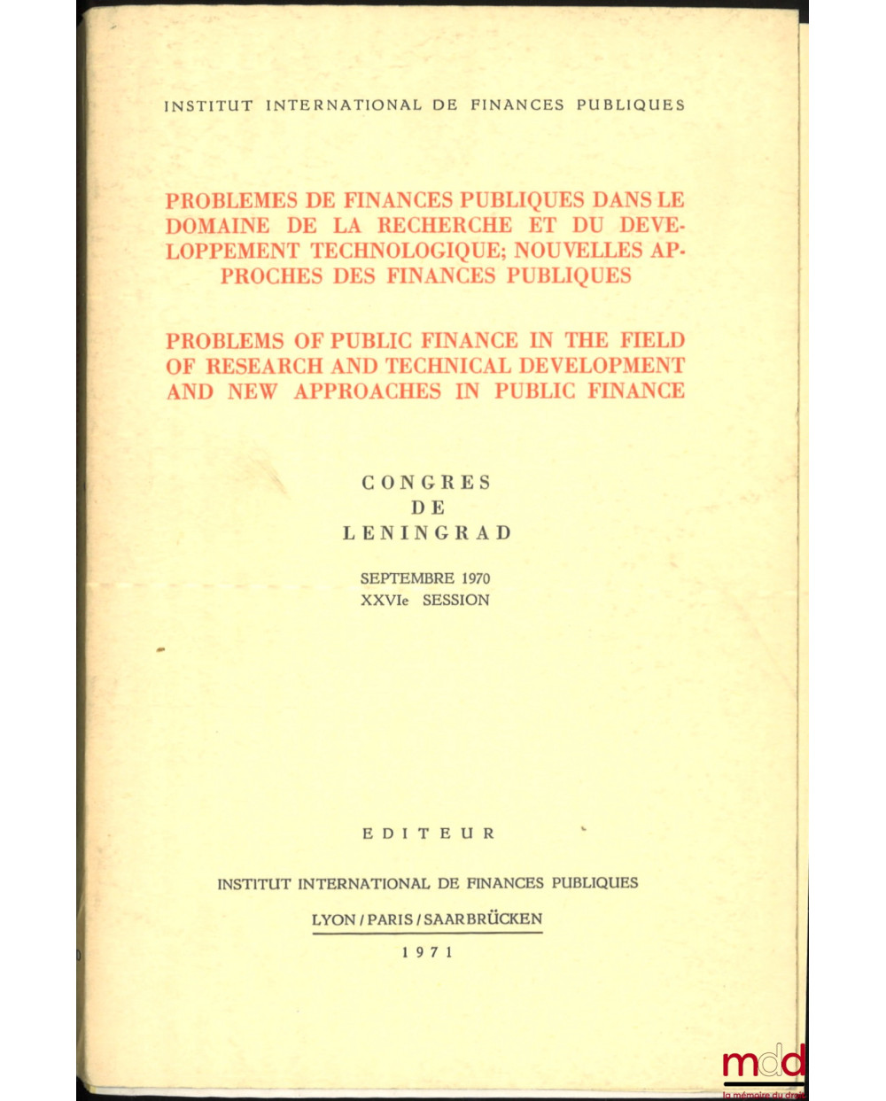 PROBLÈMES DE FINANCES PUBLIQUES DANS LE DOMAINE DE LA RECHERCHE ET DU DÉVELOPPEMENT TECHNOLOGIQUE ; NOUVELLES APPROCHES DES FINANCES PUBLIQUES, PROBLEMS OF PUBLIC FINANCE IN THE FIELD OF RESEARCH AND TECHNICAL DEVELOPMENT AND NEW APPROACHES IN PUBLIC FINANCE, Congrès de Leningrad, Septembre 1970, XXVIe session, [Avec off-print]