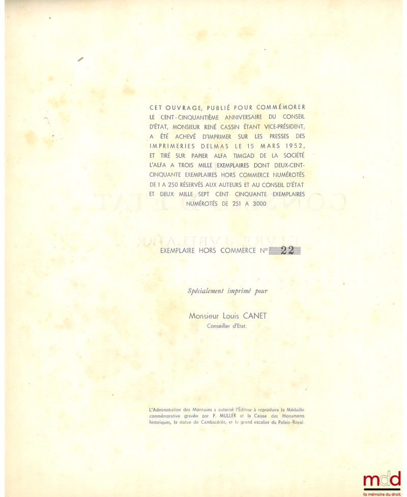 - in-8, br., non coupé, exemplaire n° 22 spécialement imprimé pour Louis CANET, Conseiller d’État, 4 photographies hors texte sur papier glacé, (une tâche sur la 1re de couv., rares rousseurs à l’int.), bon état, 693 p.
