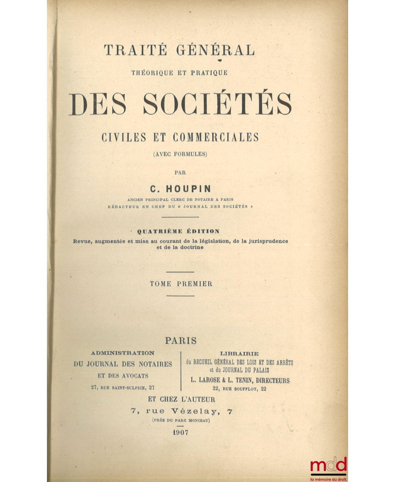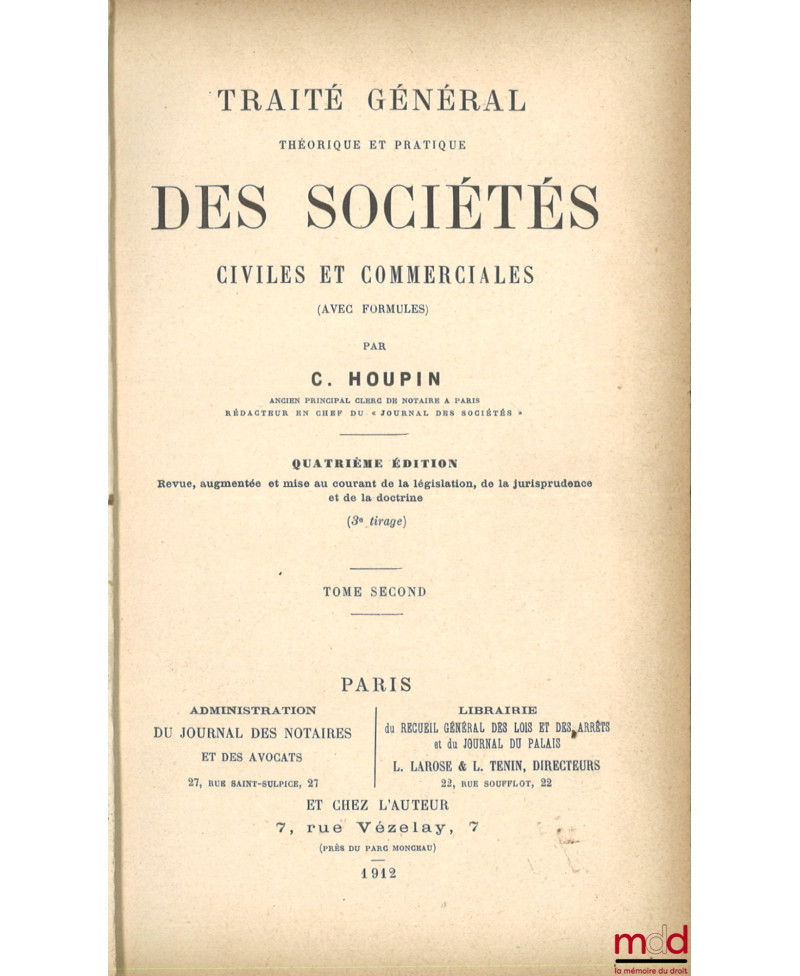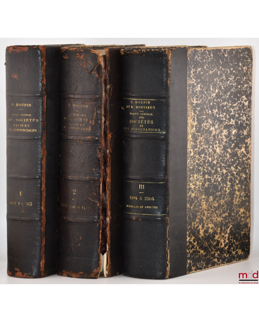 Fondateur du Journal des sociétés en 1879 (la première revue spécifiquement consacrée à cette matière), Houpin publiera en 1889 un « Traité des sociétés par actions françaises et étrangères et des sociétés d’assurance ». En 1895, il publia une seconde édition sous le titre du présent ensemble, puis une 3e en 1899, notre exemplaire faisant partie d’un second tirage, mis à jour, de cette édition. La destinée éditoriale de l’ouvrage se prolongera ensuite avec une 4e éd. en 1909. En 1919, il connaîtra une nouvelle forme, sous l’impulsion de Bosvieux, qui publiera une 5e éd. en 3 vol., intégrant notamment le droit des associations, et celui des sociétés civiles. Cette édition fera l’objet de nombreux tirages mis à jour (5e tirage en 1925), elle sera ensuite refondue à l’occasion d’une 6e éd. (1927) puis d’une 7e (1935-37). Il figure comme un classique dans l’ensemble des biblio. des grands manuels de droit commercial de l’après guerre et constitue une source précieuse, compte-tenu de la précision des ref. jurisprudentielles, pour l’étude la cette matière.