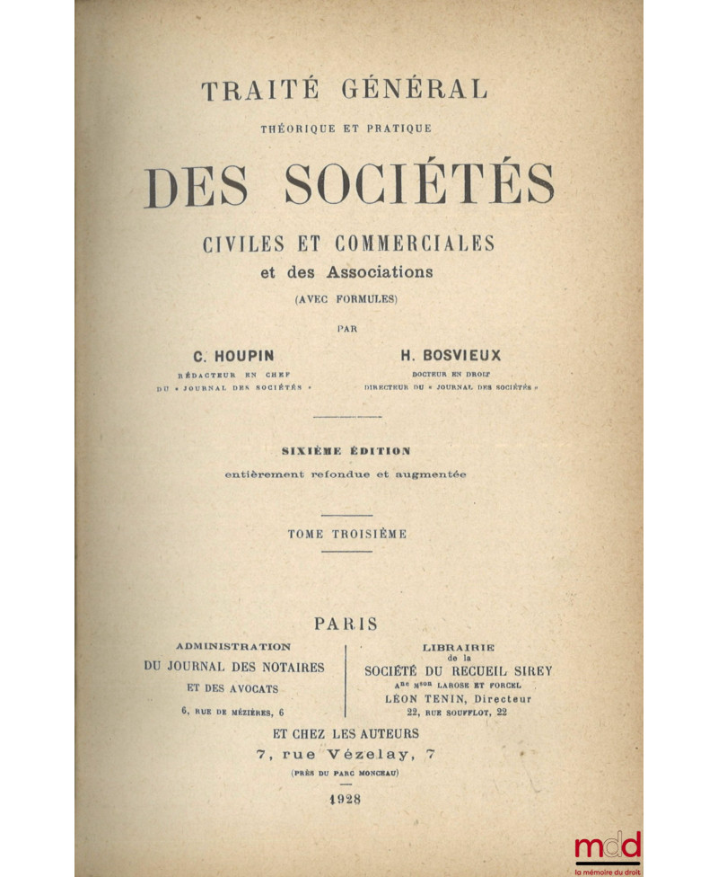 TRAITÉ GÉNÉRAL THÉORIQUE ET PRATIQUE DES SOCIÉTÉS CIVILES ET COMMERCIALES ET DES ASSOCIATIONS (avec formules), 4e éd. revue, augmentée et mise au courant de la législation, de la jurisprudence et de la doctrine (t. I et II), 6e éd. entièrement refondue et augmentée (t. III)