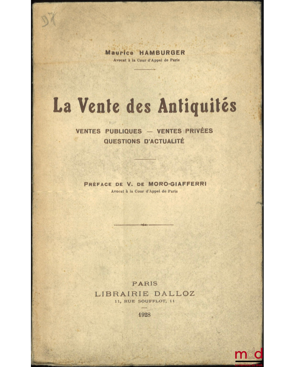 LA VENTE DES ANTIQUITÉS. Ventes publiques - Ventes privées - Questions d’actualité, Préface de Vincent de Moro-Giafferri