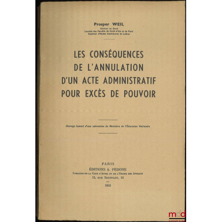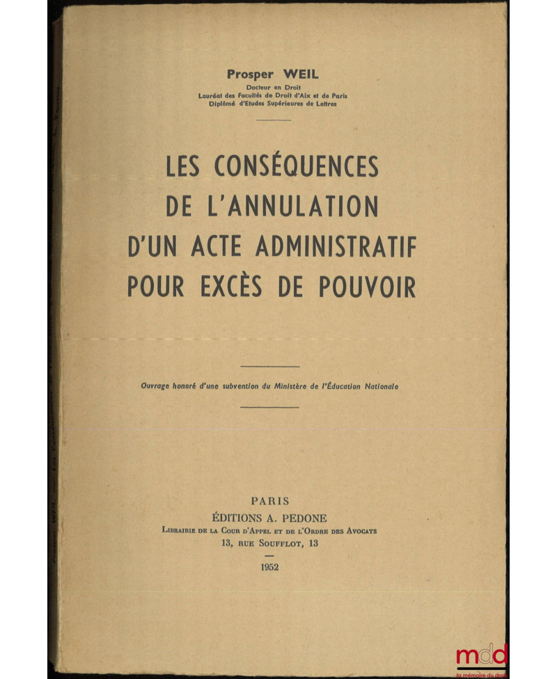 « Le 14 février 1952, il soutient sa thèse de doctorat sur les conséquences de l’annulation d’un acte administratif pour excès de pouvoir, devant un jury prestigieux composé de Marcel Waline, qui le préside, de Georges Vedel et de Charles Eisenmann.Âgé de vingt-cinq ans, Prosper Weil soutient une thèse qui peut être regardée comme un modèle. Les qualités dont toute son œuvre témoigne sont déjà présentes : la capacité à aller à l’essentiel, la liberté de pensée, le sens de la formule, l’anticipation de l’avenir.Bien des thèses d’aujourd’hui gagneraient à revenir au format de celle de Prosper Weil, qui présente sa réflexion en à peine trois cent cinquante pages, sans aucune de ces lourdeurs qui trop souvent encombrent la démonstration. Le jeune auteur pense par lui-même et fait parfois preuve d’une liberté qui frise l’impertinence. Ainsi, il n’hésite pas à écrire que « Laferrière, d’ordinaire si clairvoyant, commet ici une singulière erreur de raisonnement » ou qu’une analyse du doyen Bonnard est « un pur sophisme ». En termes prévenants, la critique peut s’adresser au Conseil d’État lui-même, dont, écrit Prosper Weil, les arrêts « ne disent que l’indispensable et souvent même moins ». Avec un goût très sûr de l’image, Prosper Weil trouve des formules qui jettent une grande clarté sur les constructions juridiques. Il observe ainsi que « l’annulation pour excès de pouvoir est comme une coulée de lave qui renverse tous les obstacles sur son passage ». De manière plus saisissante encore, il écrit ceci : « Comme Moïse disait aux Hébreux: “Voici, je place devant toi la bénédiction et la malédiction, la vie et la mort – et tu choisiras la vie”, ainsi le Conseil d’État rend à l’administration toute sa liberté mais ajoute implicitement “– et tu choisiras la légalité” ». (B. Stirn, La vie et les travaux de Prosper Weil, Académie des Sciences morales et politiques, 04/2022).