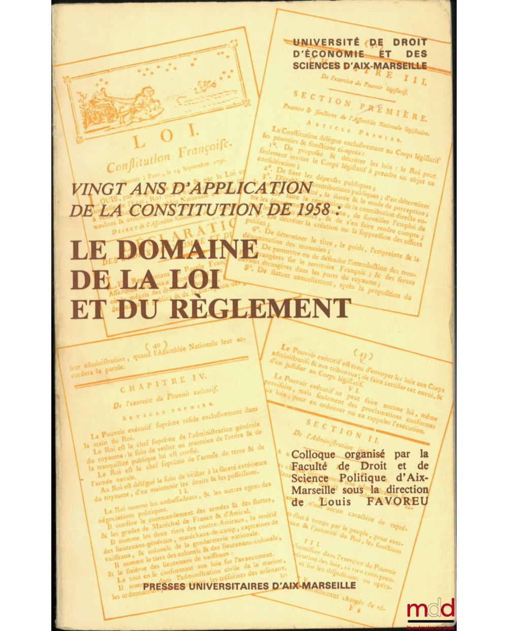 VINGT ANS D’APPLICATION DE LA CONSTITUTION DE 1958 : LE DOMAINE DE LA LOI ET DU RÈGLEMENT, L’application des articles 34 et 37 de la constitution depuis 1958, Bilans et perspectives ; Colloque organisé par la Faculté de Droit et de Science Politique d’Aix-Marseille les 2 et 3 décembre 1977 sous la direction de Louis FAVOREU