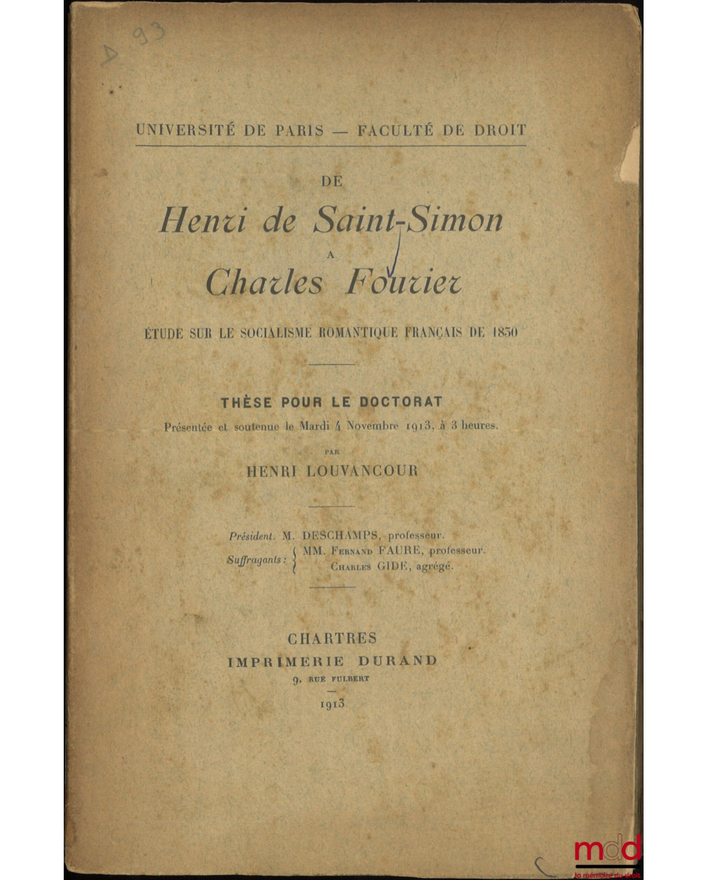 DE HENRI DE SAINT-SIMON À CHARLES FOURIER, Étude sur le socialisme romantique français de 1830, Thèse pour le doctorat (Président : Deschamps ; Suffragants : Fernand Faure, Charles Gide), Université de Paris - Faculté de droit