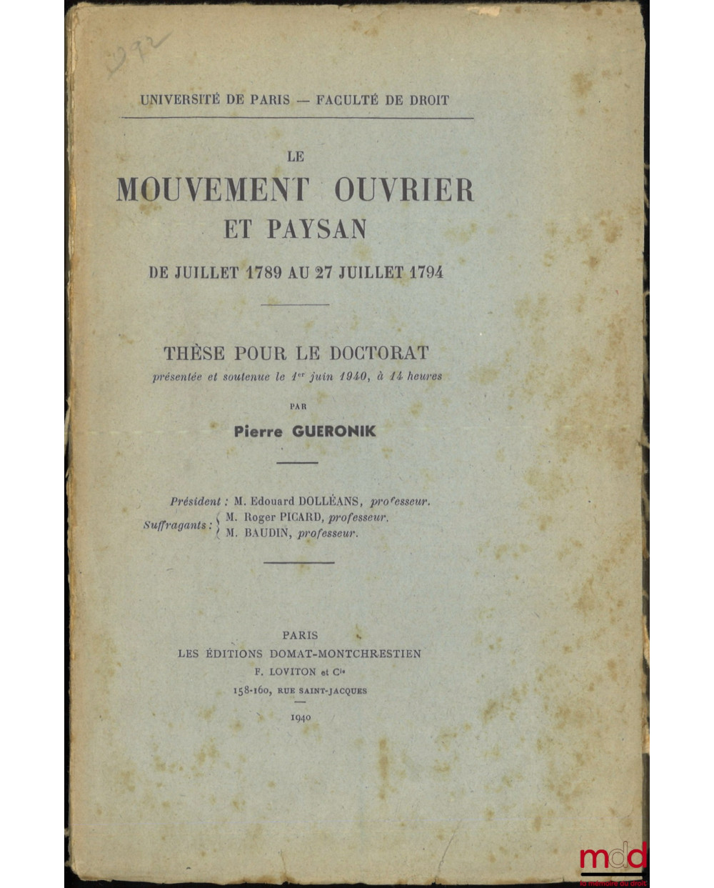 LE MOUVEMENT OUVRIER ET PAYSAN De juillet 1789 au 27 juillet 1794, Thèse (Président : Dolléans ; Suffragants : Picard, Baudin), Université de Paris - Faculté de droit