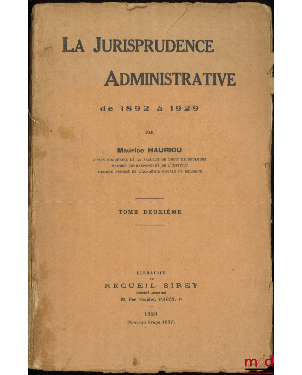 LA JURISPRUDENCE ADMINISTRATIVE DE 1892 À 1929, Notes d’arrêts sur décision du Conseil d’État et du Tribunal des conflits publiées au Recueil Sirey de 1892 à 1928, Réunies et classées par André Hauriou, [t. II uniquement]