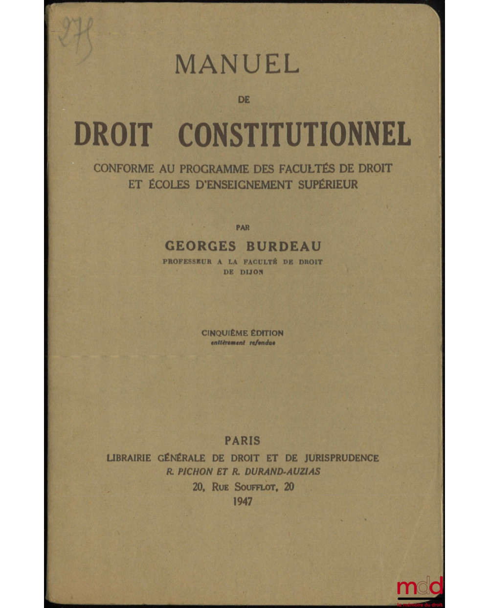 Édition assez rare du Manuel de G. Burdeau encore seul à rédiger.