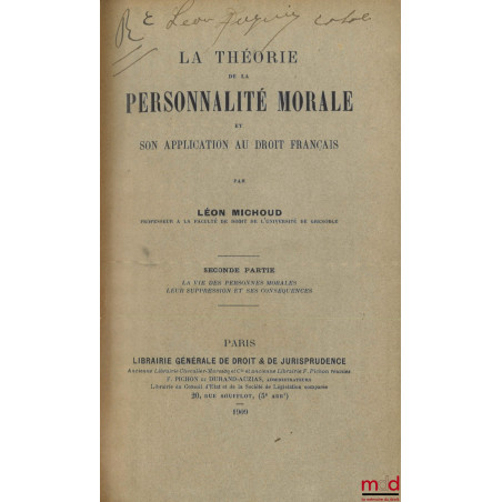 LA THÉORIE DE LA PERSONNALITÉ MORALE et son application au droit français, Première partie : Notion de personnalité morale, classification et création des personnes morales ; Seconde partie : La Vie des personnes morales, leur suppression et ses conséquences
