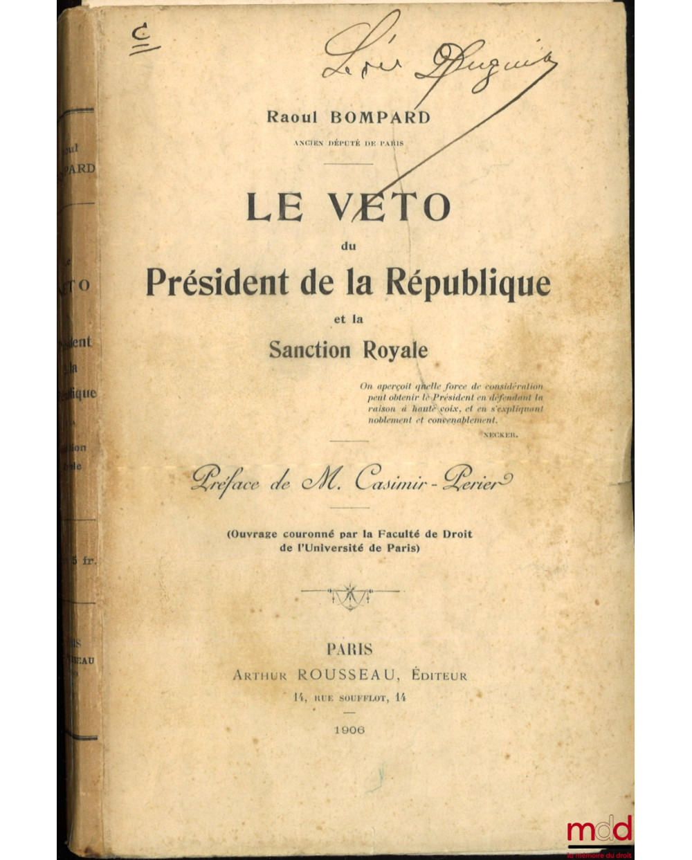 - in-8, débr., Ex-libris manuscrit « Léon Duguit », qq. documents iconographiques, (mq. p. 5 à 89 soit les chapitres 1 et 2 : La sanction royale et la sanction royale dans les colonies, lég. fané, dos insolé, des rousseurs et qq. annotations au crayon à l’int.), [ce livre provient de la bibliothèque personnelle de Léon DUGUIT], X-285 p.