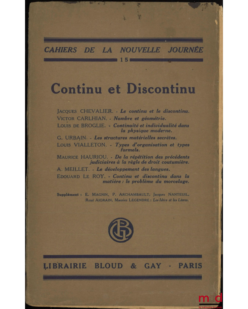 Les cahiers de la nouvelle journée ont consacré leur 15e volume aux questions juridiques. Celui-ci contient plusieurs articles de référence : Jacques Chevalier, Le continu et le discontinu. ; Victor Carlhian, Nombre et géométrie. ; Louis de Broglie, Continuité et individualité dans la physique moderne. ; G. Urbain, Les structures matérielles secrètes. ; Louis Vialleton, Types d’organisation et types formels. ; Maurice Hauriou, De la répétition des précédents judiciaires à la règle de droit coutumière. ; A. Meillet, Le développement des langues. ; Édouard Le Roy, Continu et discontinu dans la matière : le problème du morcelage.
