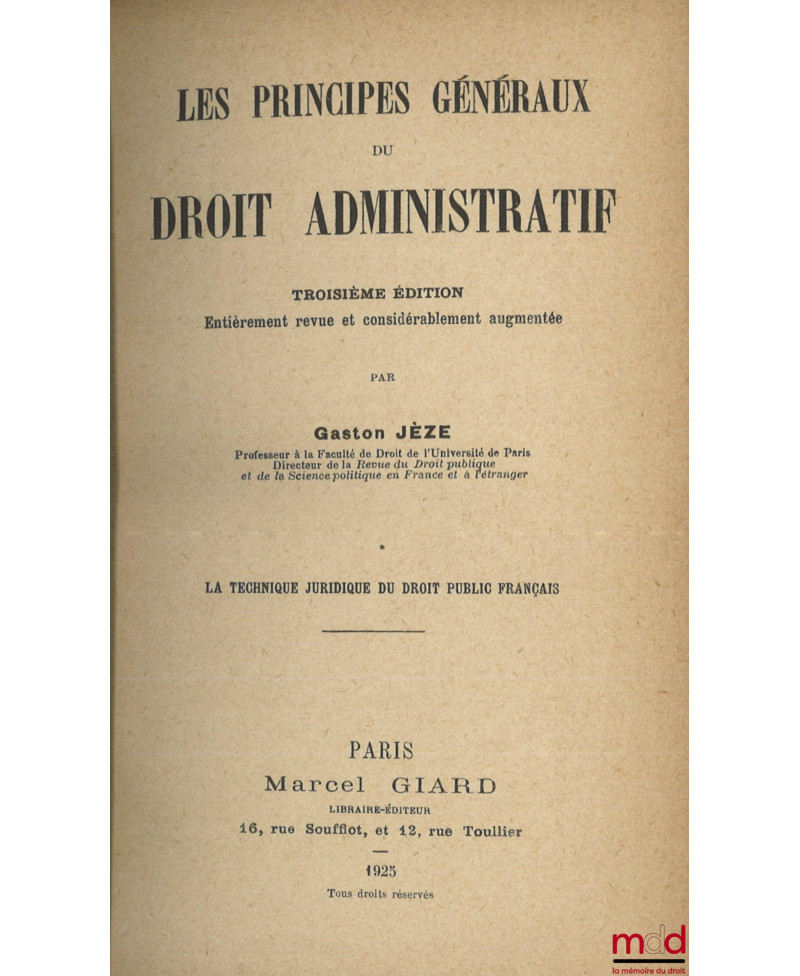 Principes généraux du droit administratif de Jèze qui contient l’essentiel de sa réflexion sur la nature des actes juridiques et sur le service public. On y décèle d’ailleurs une anticipation des lois du service public généralement considérées comme ayant été formulées en premier lieu par L. Rolland. Dernière édition.