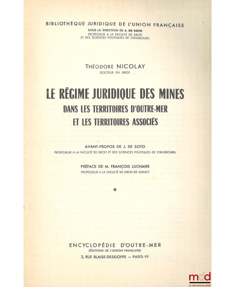 LE RÉGIME JURIDIQUE DES MINES DANS LES TERRITOIRES D’OUTRE-MER ET LES TERRITOIRES ASSOCIÉS, Avant-propos de Jean De Soto, Préface de François Luchaire, Bibl. juridique de l’Union française