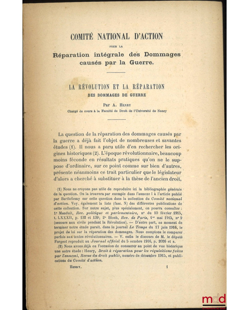 LA RÉVOLUTION ET LA RÉPARATION DES DOMMAGES DE GUERRE, Comité national d’action pour la réparation intégrale des dommages causés par la guerre