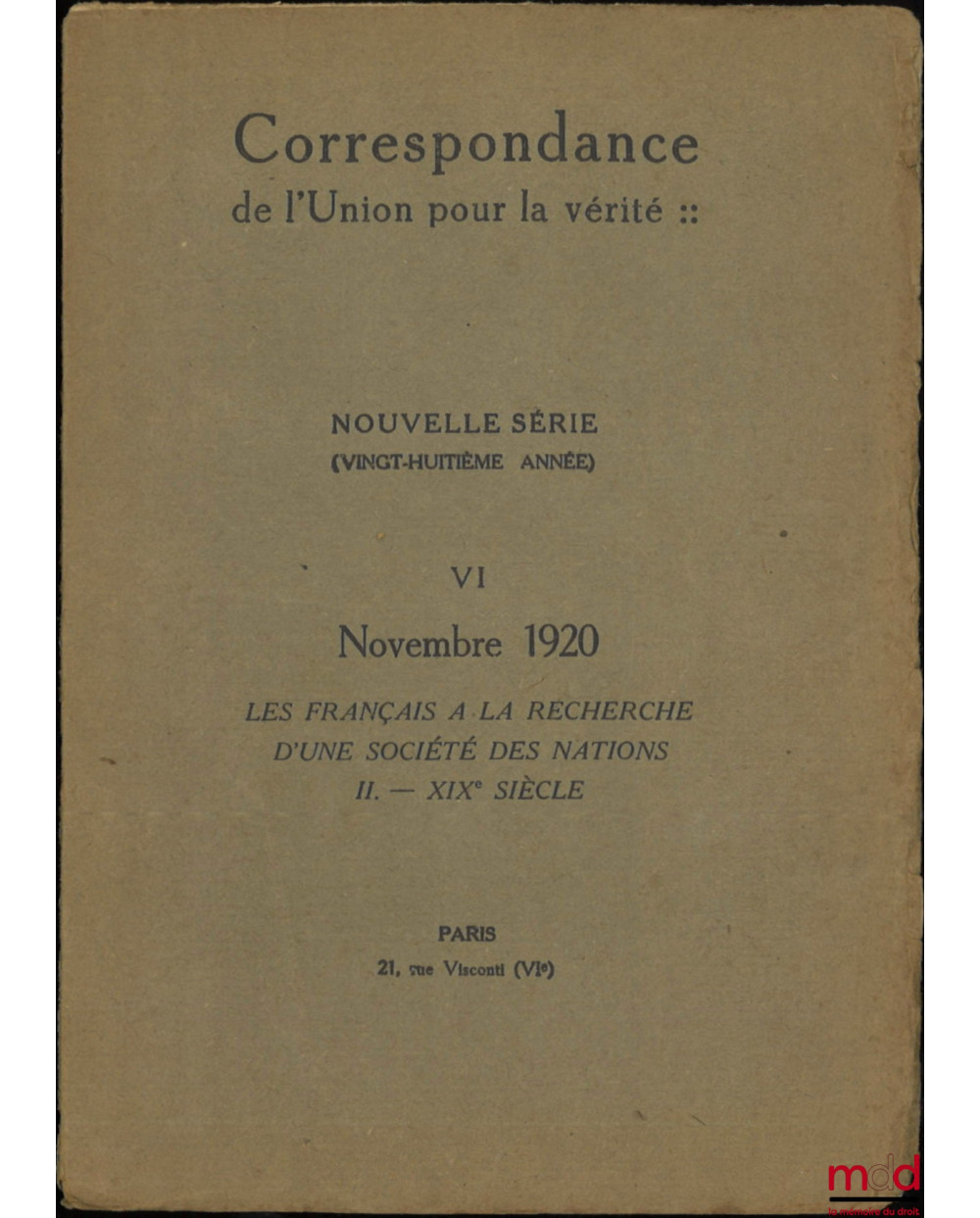 VERS UNE CONFÉDÉRATION DES PUISSANCES DE L’ENTENTE, Correspondance de l’Union pour la vérité, Nouvelle série (vingt-huitième année), VI, Novembre 1920, [Extrait]