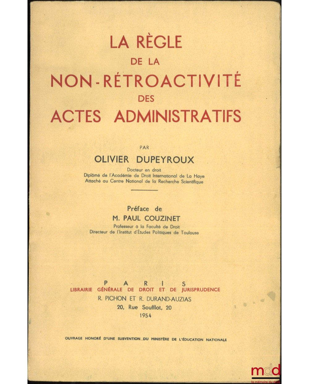 LA RÈGLE DE LA NON-RÉTROACTIVITÉ DES ACTES ADMINISTRATIFS, Préface de Paul Couzinet