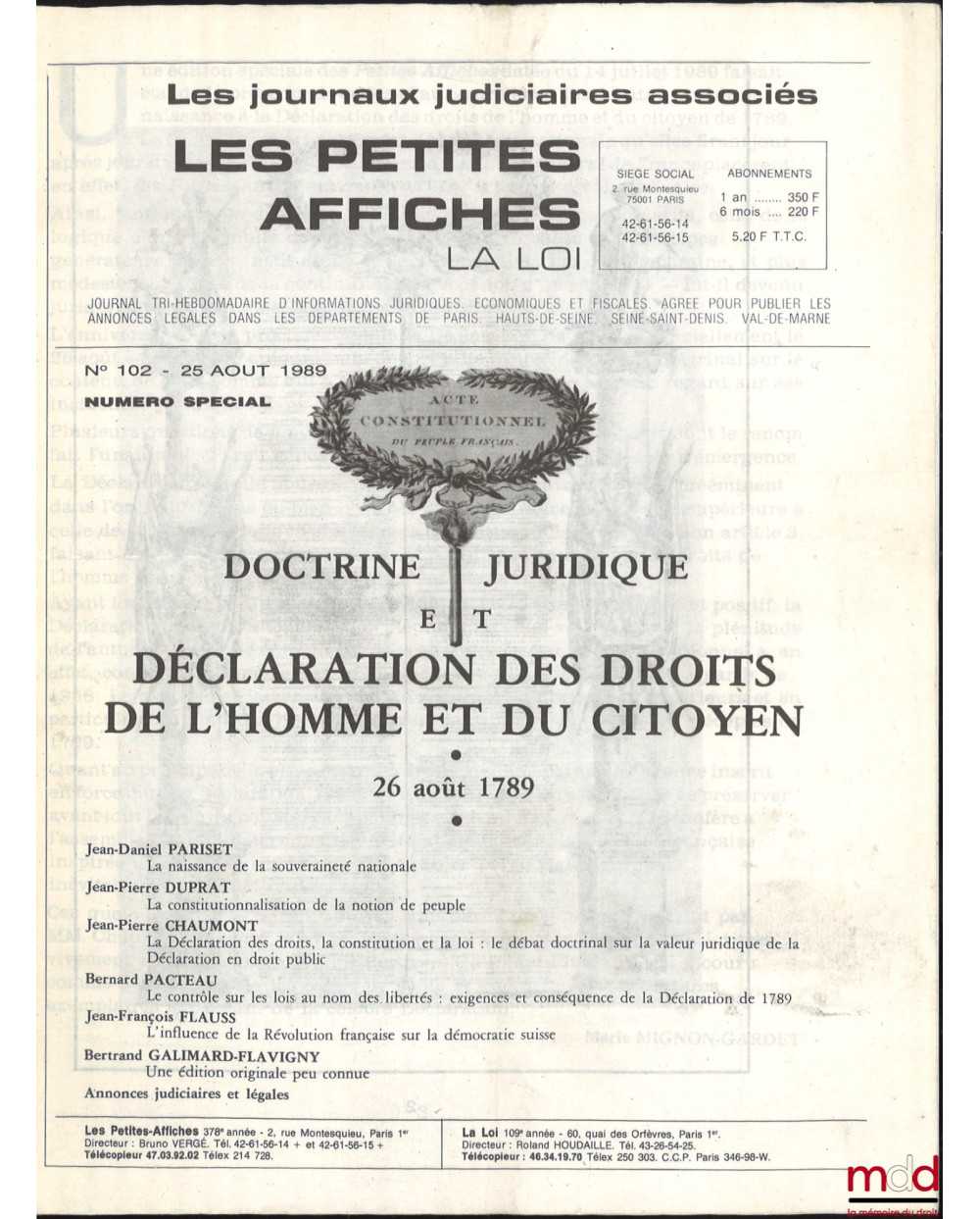 DOCTRINE JURIDIQUE ET DÉCLARATION DES DROITS DE L’HOMME ET DU CITOYEN, 26 août 1789, Les Petites Affiches - La loi, n° 102 - 25 août 1989, Numéro spécial