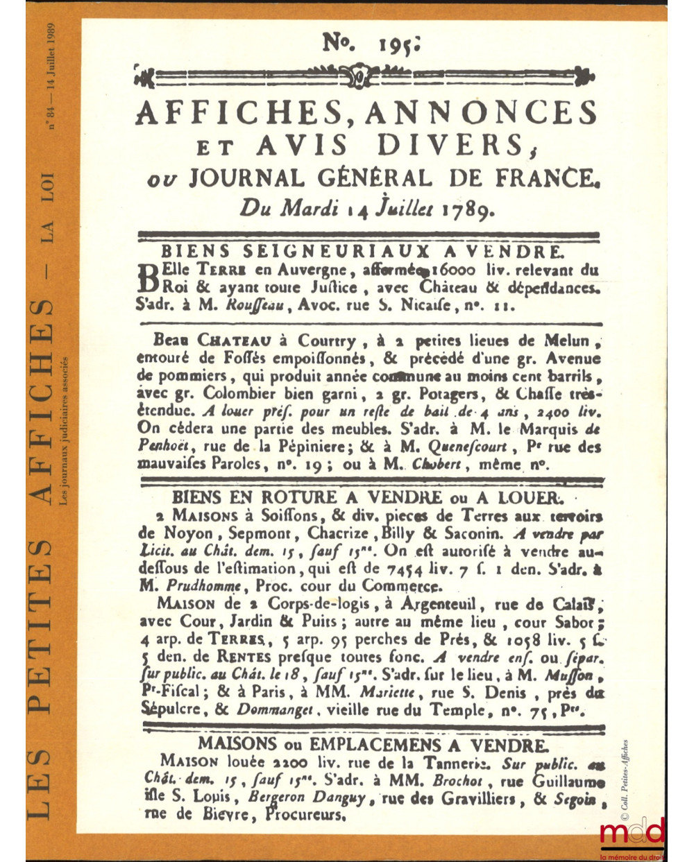 Description : in-4, plaquette représentant le Fac-similé du n° 195 des Affiches, annonces et avis divers ou Journal Général de France du mardi 14 juillet 1789, nb. gravures, bon état, 114 p.