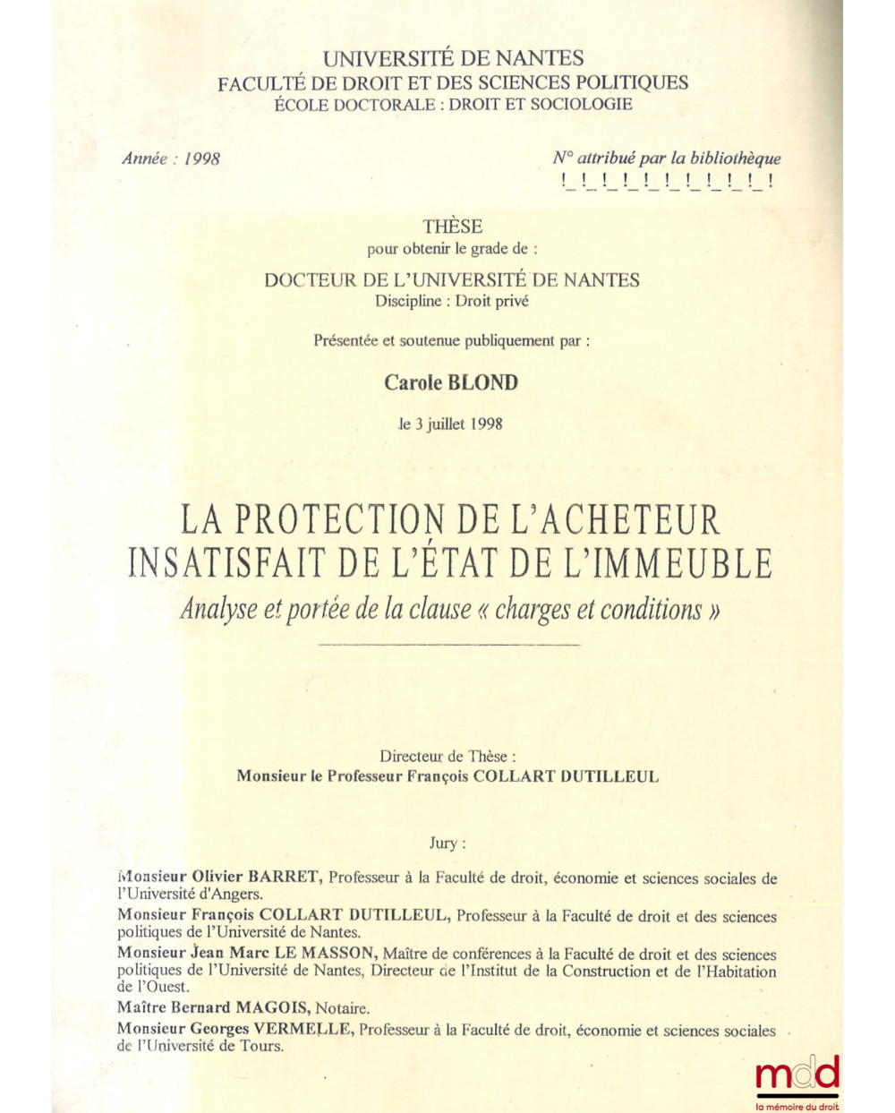 LA PROTECTION DE L’ACHETEUR INSATISFAIT DE L’ÉTAT DE L’IMMEUBLE, Analyse et portée de la clause « charges et conditions », Thèse (dir : François Collart Dutilleul), Université de Nantes, Faculté de droit et des sciences politiques
