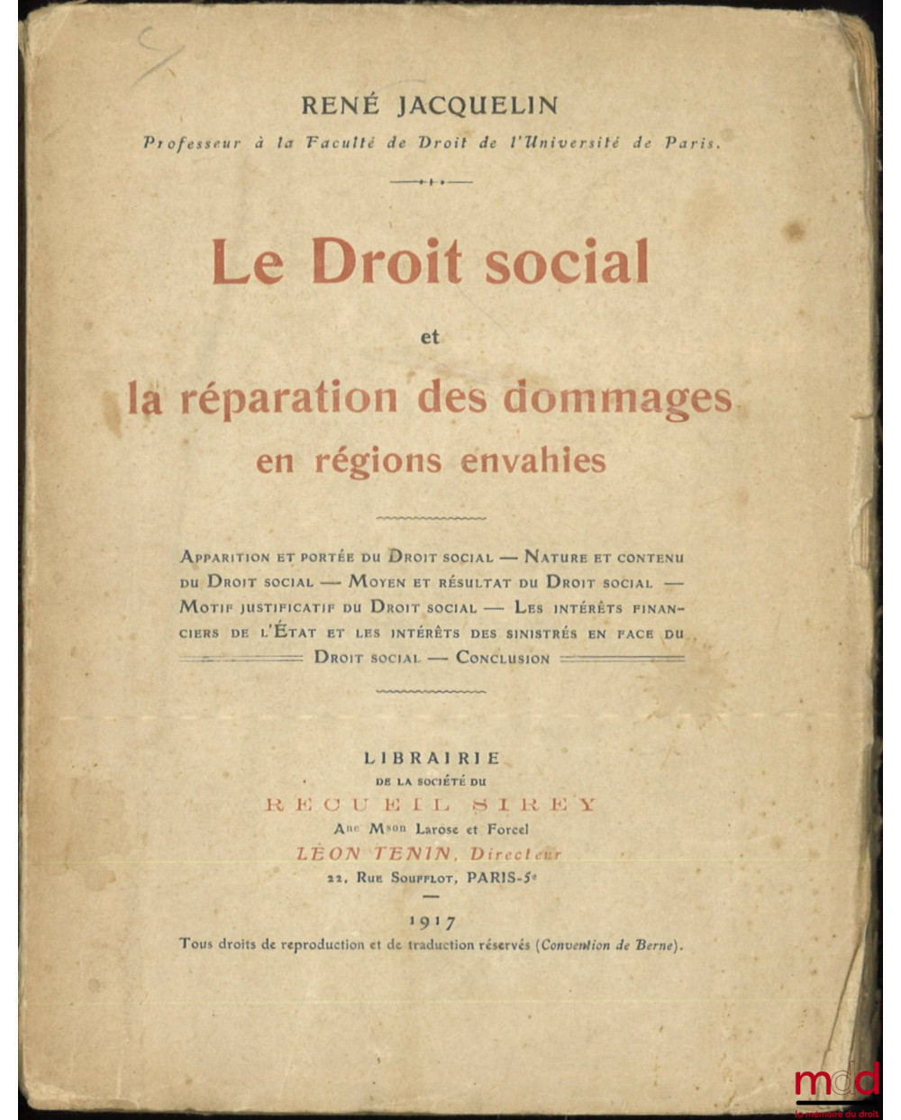 LE DROIT SOCIAL et la réparation des dommages en régions envahies, Apparition et portée du Droit social - Nature et contenu du Droit social - Moyen et résultat du Droit social - Motif justificatif du Droit social - Les intérêts financiers de l’État et les intérêts des sinistrés du Droit social - Conclusion