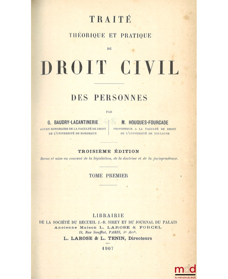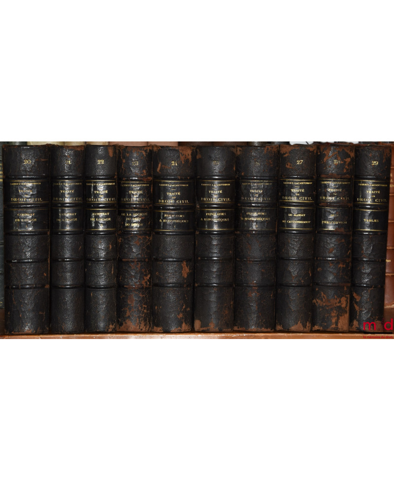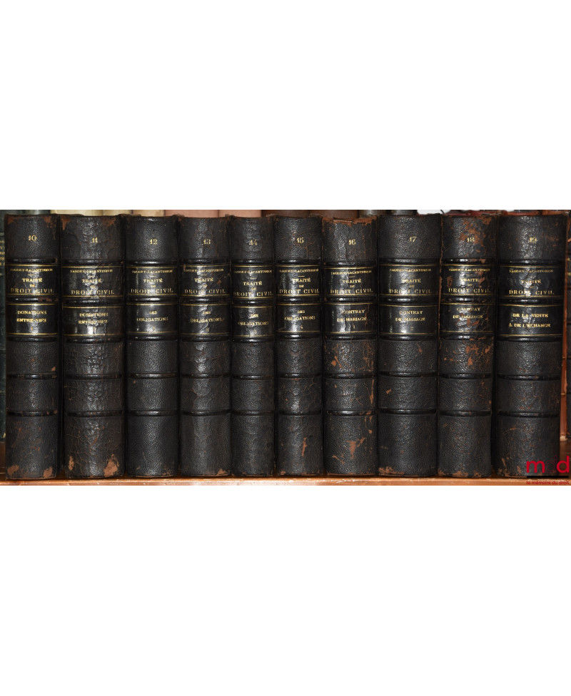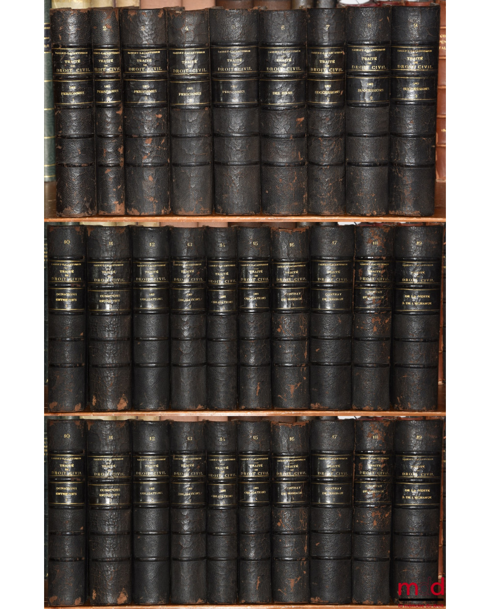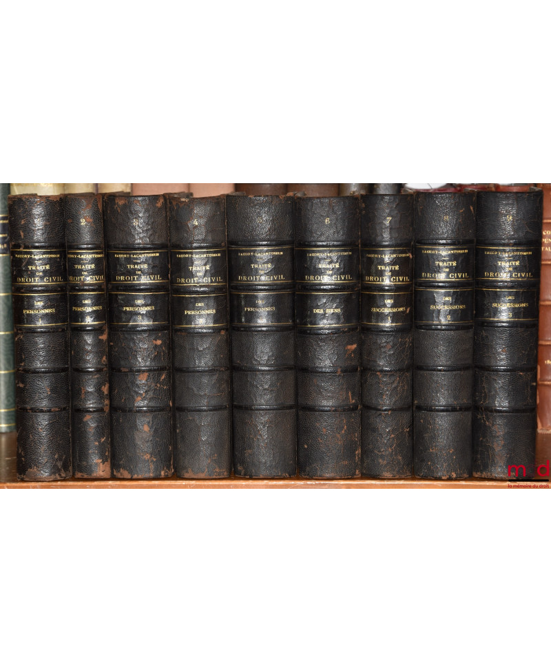 TRAITÉ THÉORIQUE ET PRATIQUE DE DROIT CIVIL, 3e éd. :Des personnes, Avec Houques-Fourcade, Chauveau, Chéneaux et Bonnecarrère, (1907-1908), 5 vol. ;Des Biens, Avec Chauveau, (1905), 1 vol. ;Des Successions, Avec Wahl, (1905), 3 vol. ;Des Donations entre vifs et testaments, Avec Colin, (1905), 2 vol. ;Des Obligations, Avec Barde, (1905-1908), 4 vol. ;Du Contrat de Mariage, Avec J. Le Courtois et F. Surville, (1906), 3 vol. ;De la Vente et de l’Échange, Avec Saignat, (1908), 1 vol. ;Du Contrat de Louage, Avec Wahl, (1906-1907), 3 vol. ;De la société, du prêt, du dépôt, Avec Wahl, (1907), 1 vol. ;Du nantissement, des privilèges & hypothèques et de l’expropriation forcée, Avec Loynes, (1906), 3 vol. ;Des contrats aléatoires, du mandat, du cautionnement, de la transaction, Avec Wahl, (1907), 1 vol. ;De la prescription, Avec Tissier, (1905), 1 vol. ;Tables de la 3e éd. (1909).