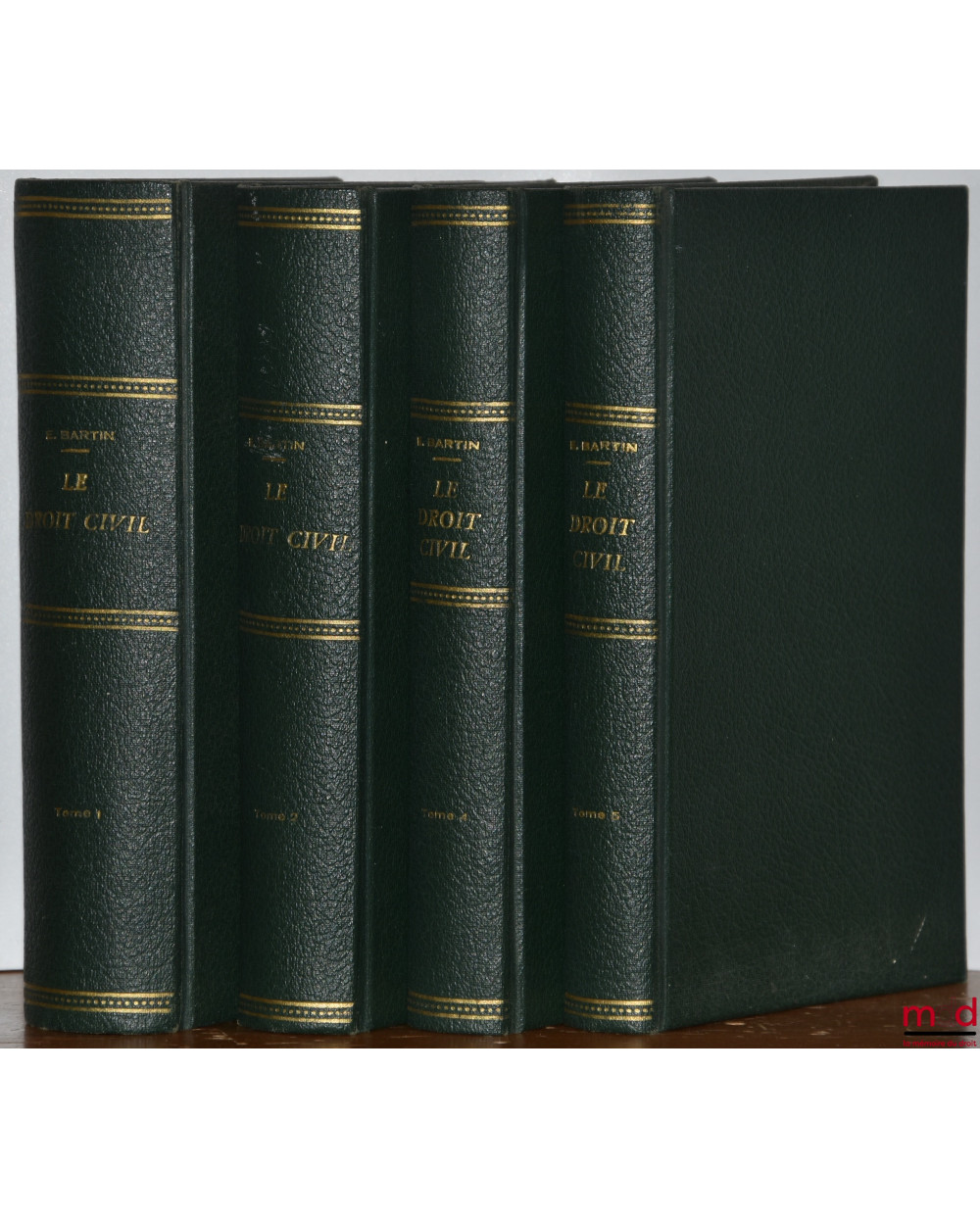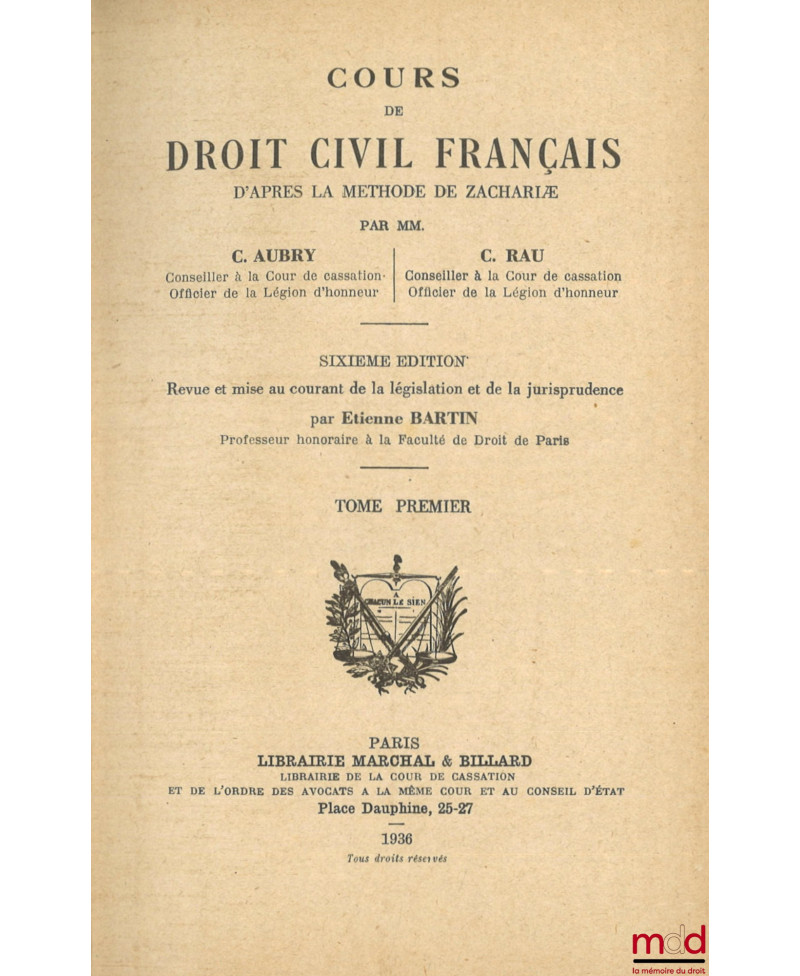 COURS DE DROIT CIVIL FRANÇAIS D’APRÈS LA MÉTHODE DE ZACHARIÆ, 6e éd. revue et mise au courant de la législation et de la jurisprudence par Étienne Bartin, [t. I, II, IV et V uniquement]