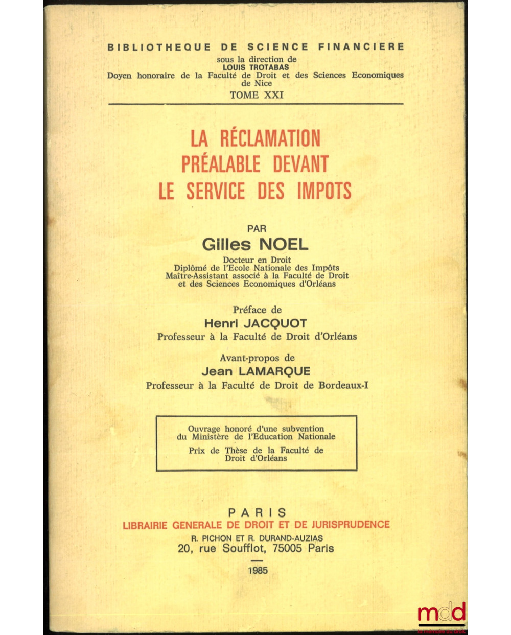 LA RÉCLAMATION PRÉALABLE DEVANT LE SERVICE DES IMPÔTS, Préface de Henri Jacquot, Avant-propos de Jean Lamarque, Bibl. de Science financière, t. XXI
