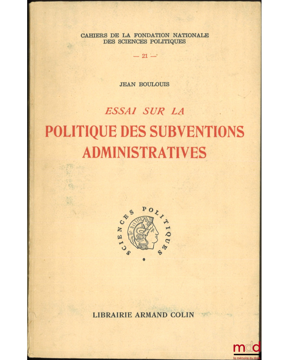 ESSAI SUR LA POLITIQUE DES SUBVENTIONS ADMINISTRATIVES, Préface de Louis Roland, Cahiers de la fondation nationale des sciences po., t. XXI