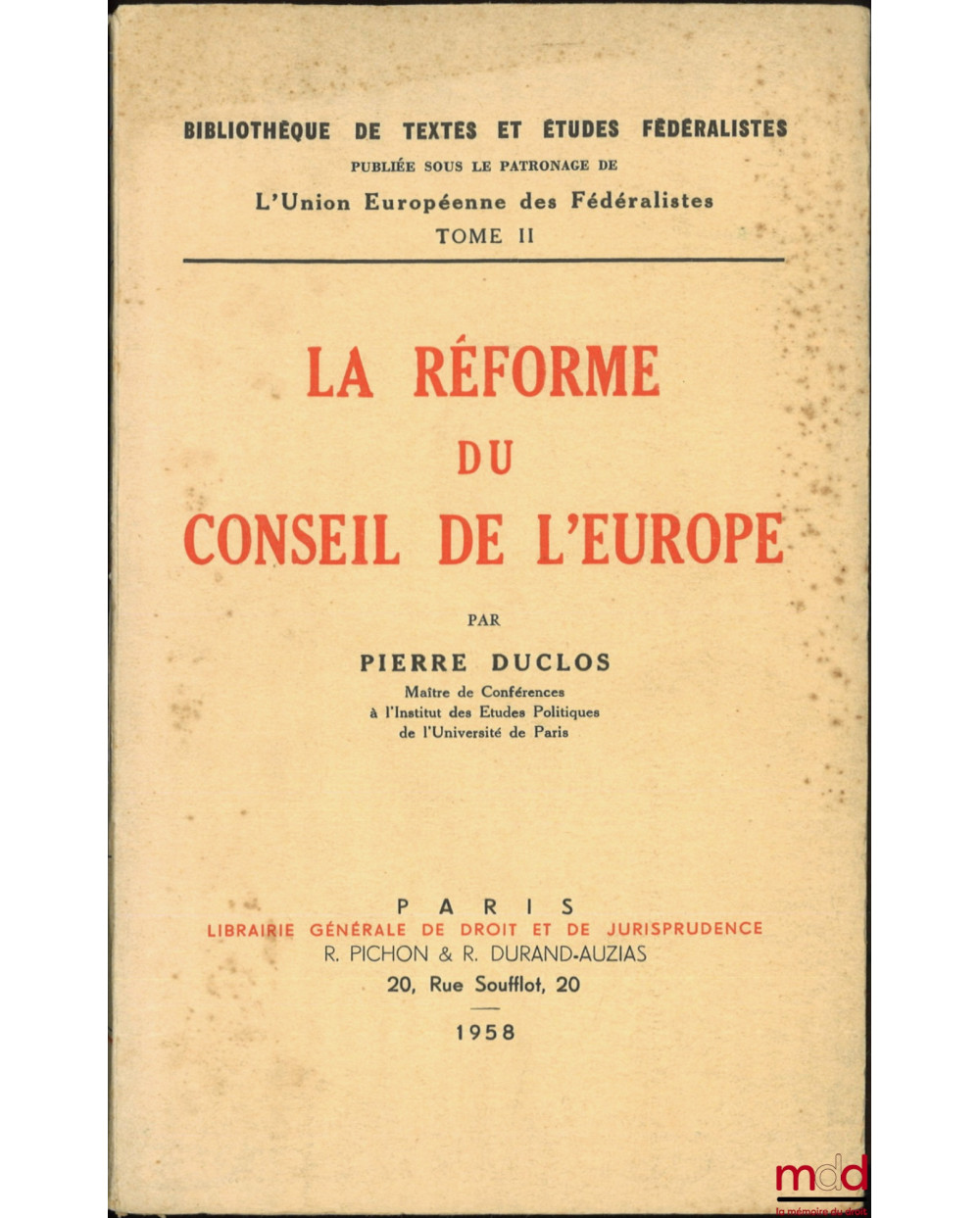 LA RÉFORME DU CONSEIL DE L’EUROPE, coll. Bibl. de textes et études fédéralistes publiée sous le patronage de l’Union Européenne des Fédéralistes, t. II