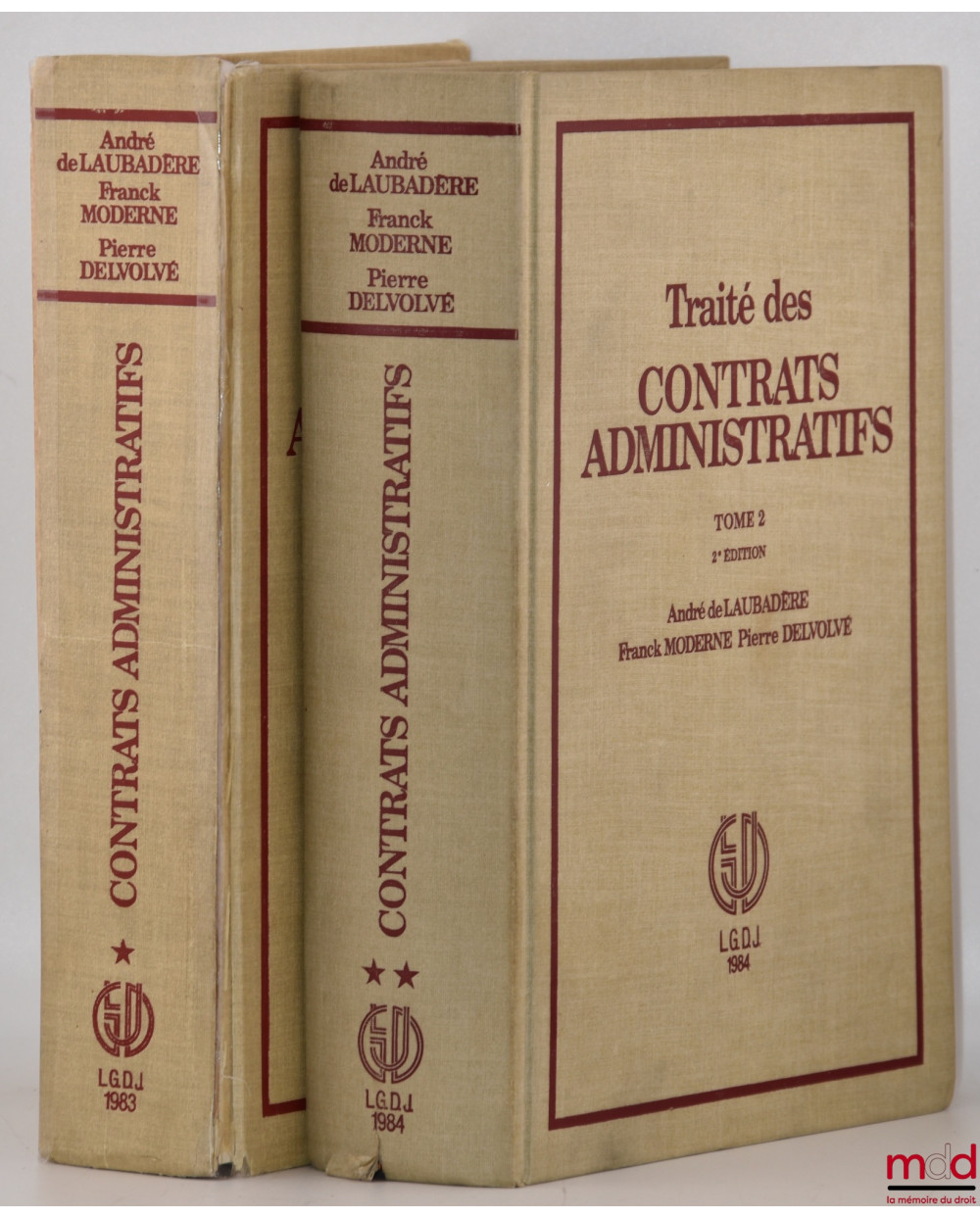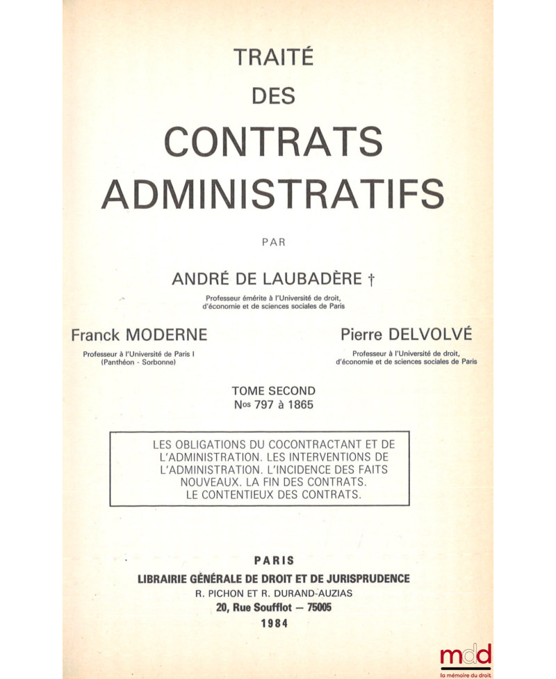 TRAITÉ DES CONTRATS ADMINISTRATIFS, 2e éd. ;t. I : La notion de contrat administratif, La formation des contrats administratifs, L’exécution des contrats administratifs : principes généraux ;t. II : Les obligations du cocontractant et de l’administration, Les interventions de l’administration, L’incidence des faits nouveaux, La fin des contrats, Le contentieux des contrats.