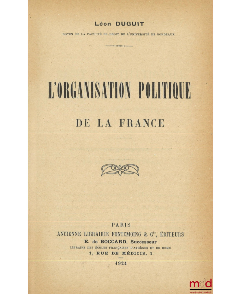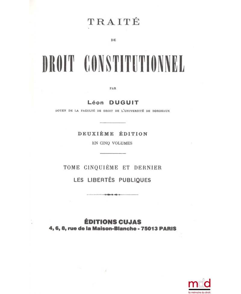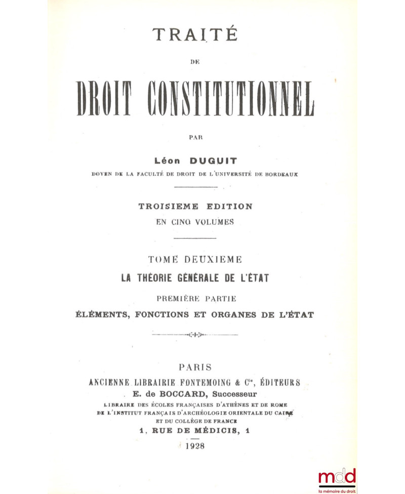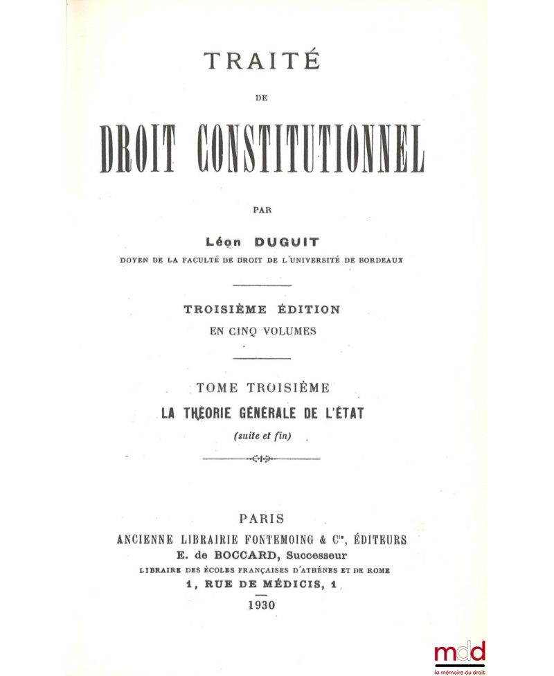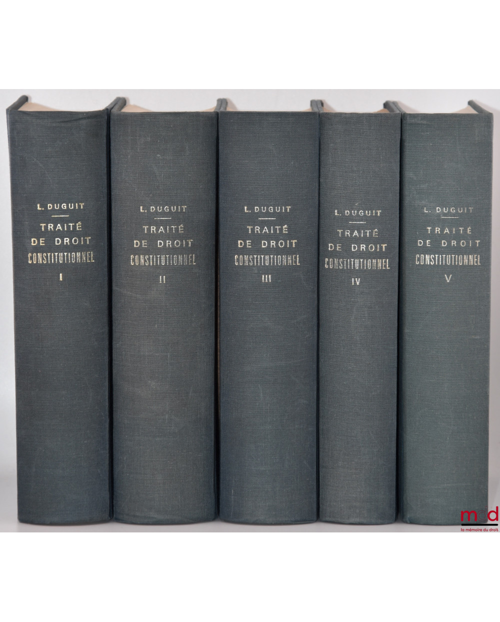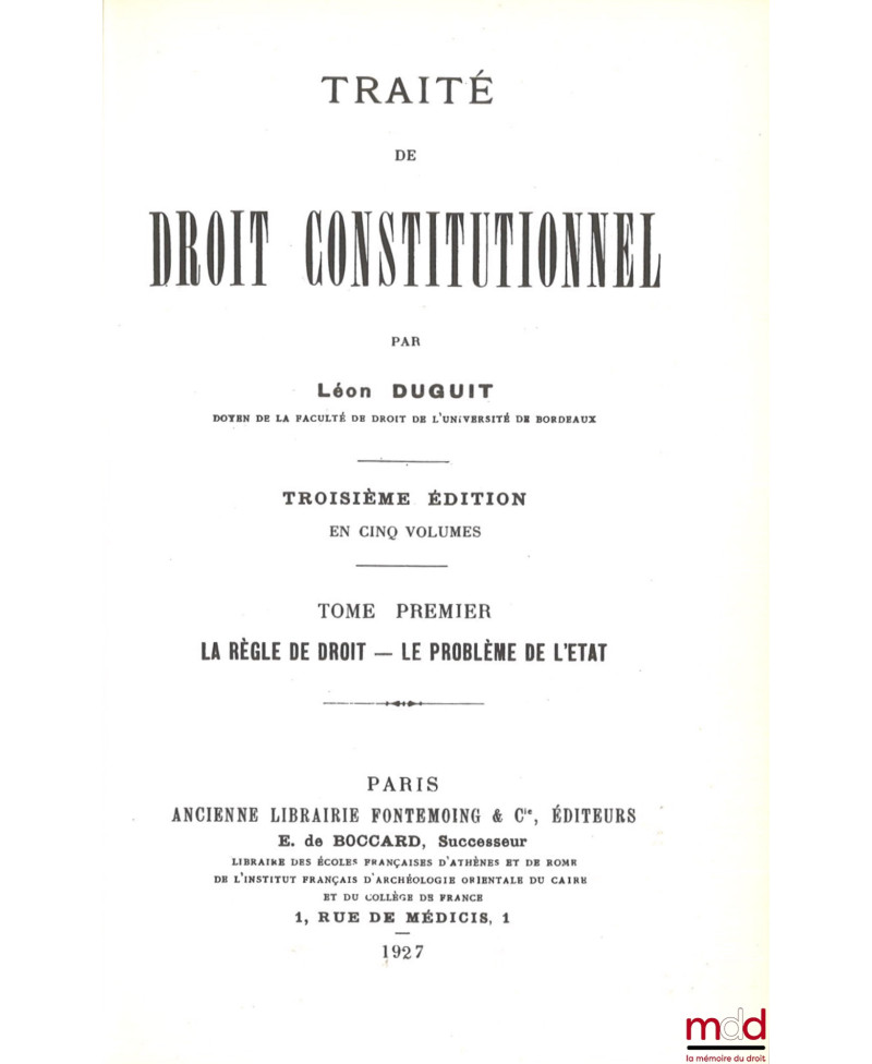 TRAITÉ DE DROIT CONSTITUTIONNEL :t. I : La règle de droit - Le problème de l’État, 3e éd. [1927, réimp.] ;t. II : La théorie générale de l’État, 1re partie : Éléments, fonctions et organes de l’État, 3e éd. [1928, réimp.]t. III : La théorie générale de l’État (suite et fin), 3e éd. [1930, réimp.] ;t. IV : L’organisation politique de la France [1924, Éd. originale] ;t. V : Les Libertés publiques, 2e éd. [1925, réimp. Cujas]