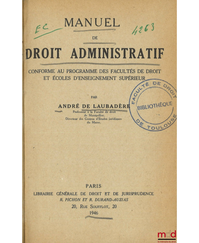Naturellement il ne faut pas attendre de ce manuel la même exhaustivité que celle du traité du même auteur, mais son caractère condensé et volontairement synthétique lui donne des attraits particuliers, spécialement en fournissant de manière ramassée des formules souvent heureuses sur les grandes définitions du droit administratif. PREMIÈRE ÉDITION.