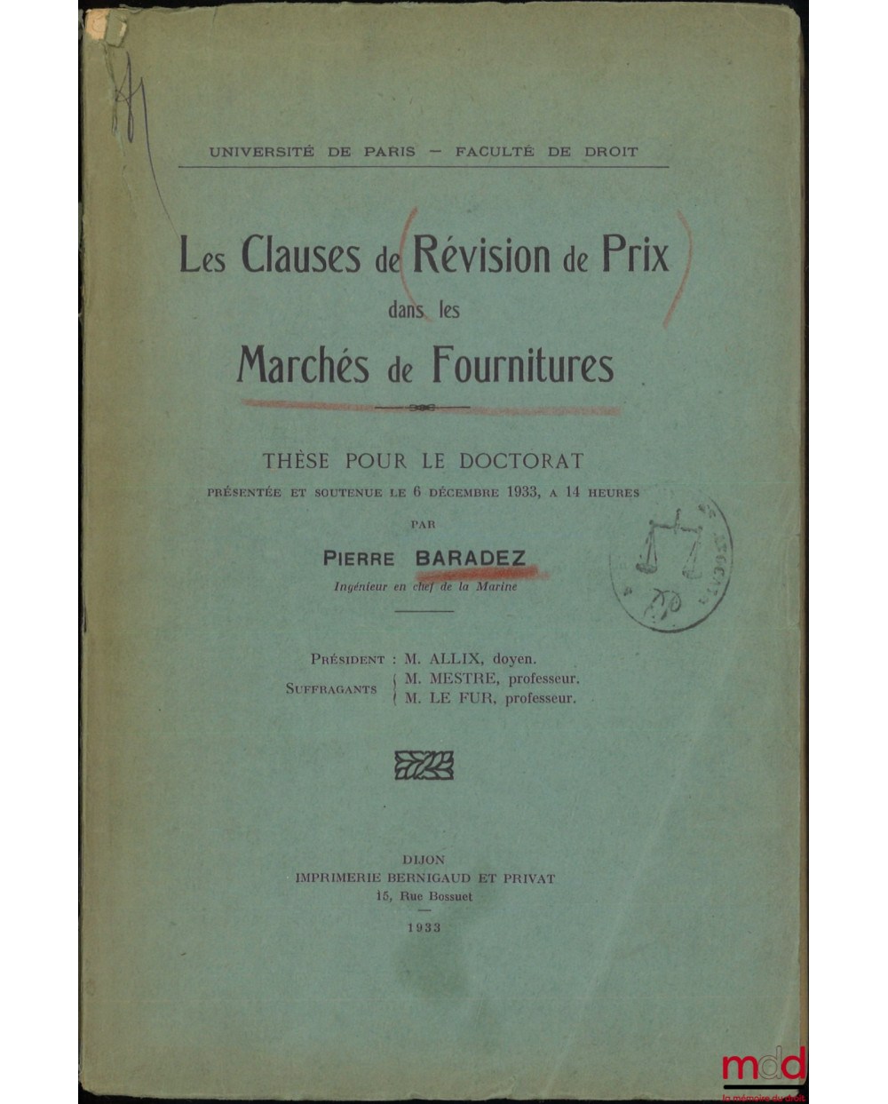LES CLAUSES DE RÉVISION DE PRIX DANS LES MARCHÉS DE FOURNITURES, Thèse, Université de Paris, Faculté de droit