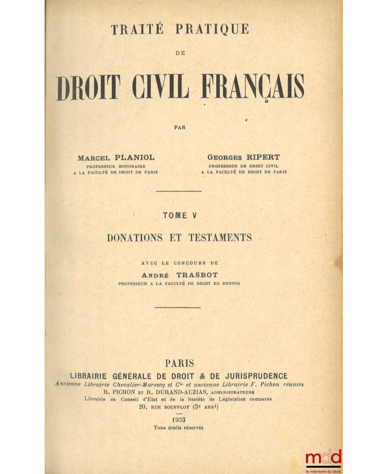 TRAITÉ PRATIQUE DE DROIT CIVIL FRANÇAIS :t. V : Donations et testaments avec le concours de André Trasbot (1030 p.) ;t. VIII : Les régimes matrimoniaux 1re partie avec le concours de Marcel Nast (760 p.) ;t. IX : Les régimes matrimoniaux 2e partie avec le concours de Marcel Nast (956 p.) ;t. X : Contrats civils 1re partie avec le concours de Joseph Hamel (Vente) et Bernard Perreau (Louage) (991 p.) ;t. XI : Contrats civils 2e partie avec le concours de André Rouast, René Savatier et Jean Lepargneur (VIII-1038 p.) ;t. XIV : Additions et tables générales (986 p.).