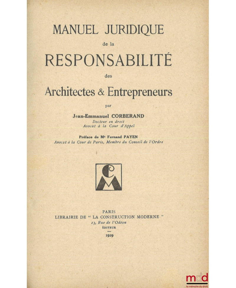 MANUEL JURIDIQUE DE LA RESPONSABILITÉ DES ARCHITECTES & ENTREPRENEURS, Préface de Fernand Payen