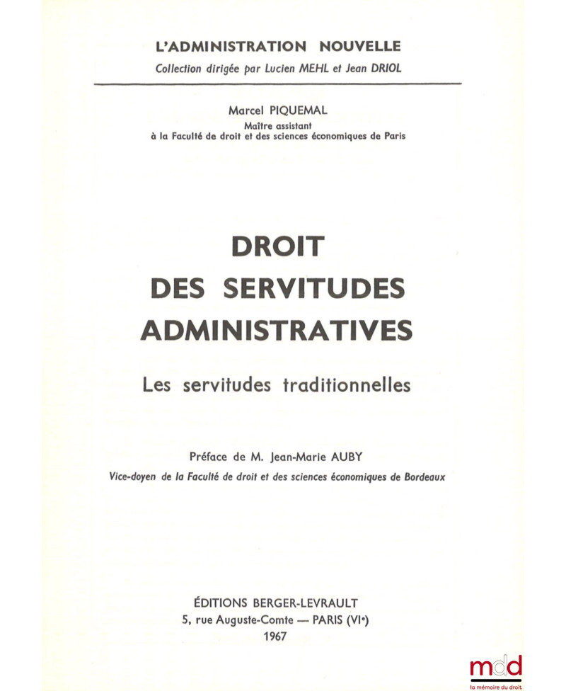 DROIT DES SERVITUDES ADMINISTRATIVES - LES SERVITUDES TRADITIONNELLES, coll. L’Administration nouvelle, Préface de Jean-Marie Auby
