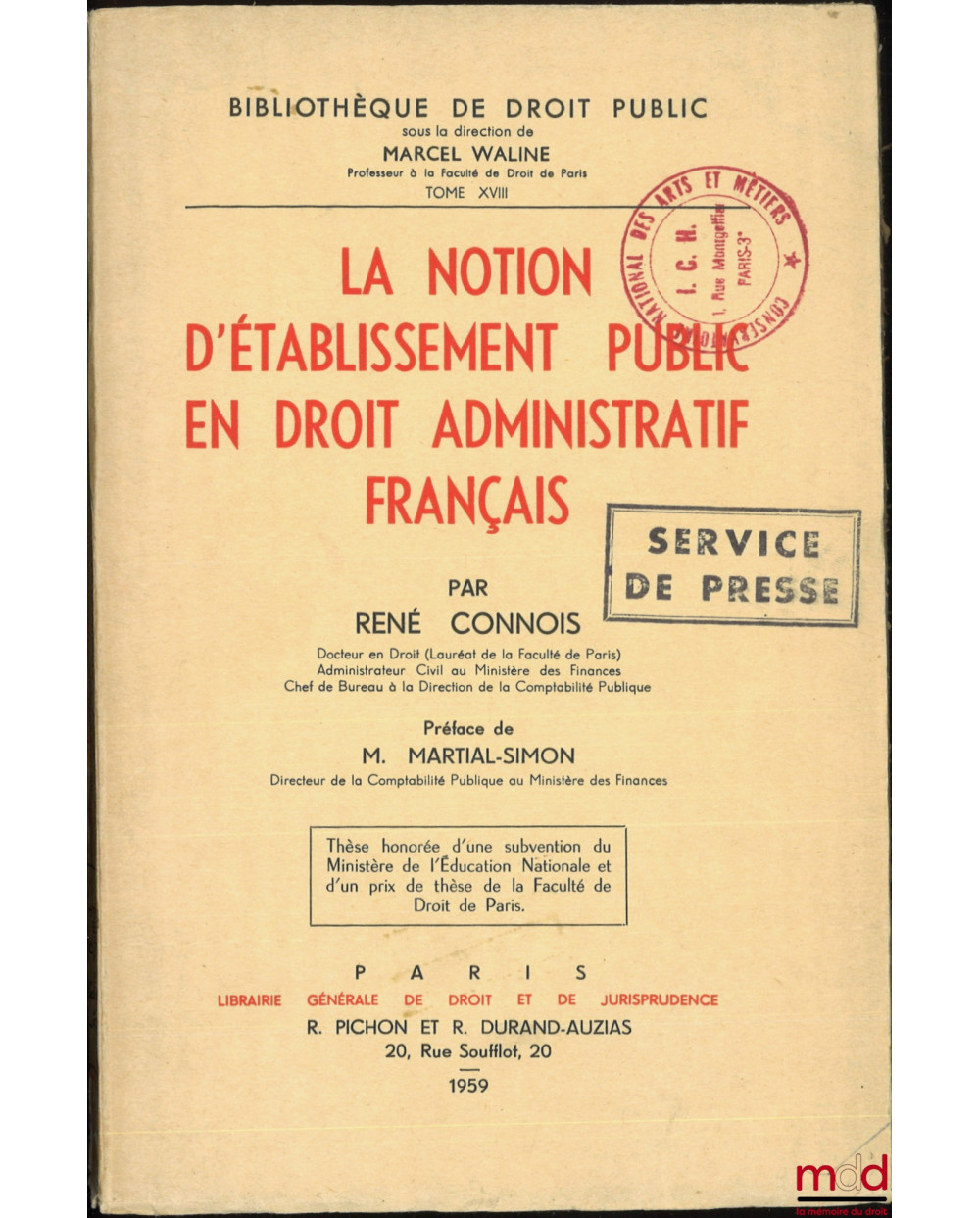 LA NOTION D’ÉTABLISSEMENT PUBLIC EN DROIT ADMINISTRATIF FRANÇAIS, Préface de Martial-Simon, Bibl. de droit public, t. XVIII