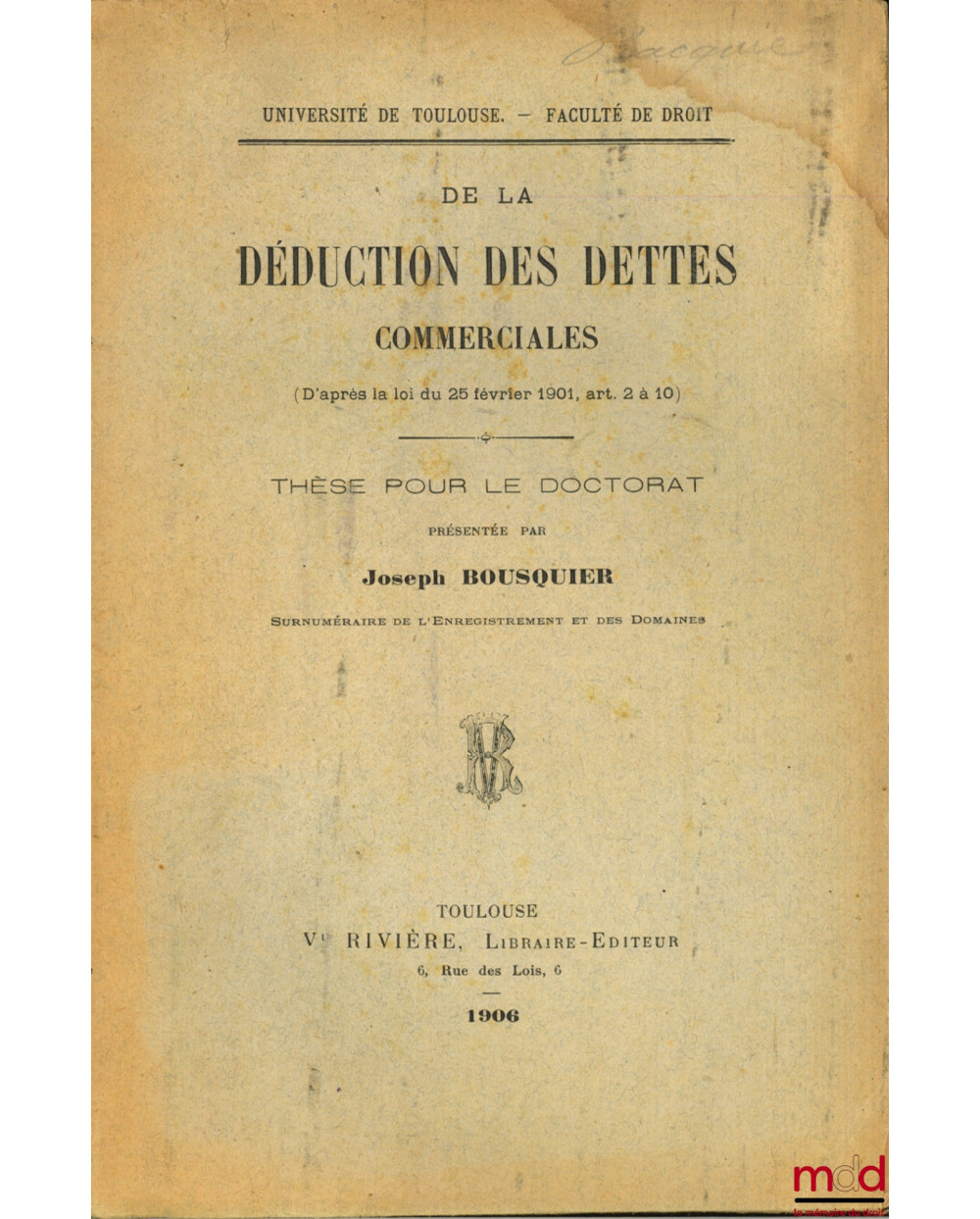 DE LA DÉDUCTION DES DETTES COMMERCIALES (D’après la loi du 25 février 1901, art. 2 à 10), Université de Toulouse, Faculté de Droit