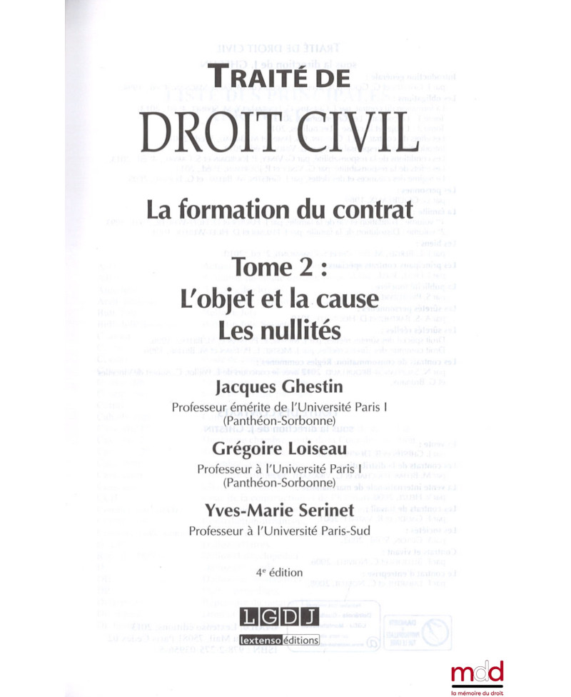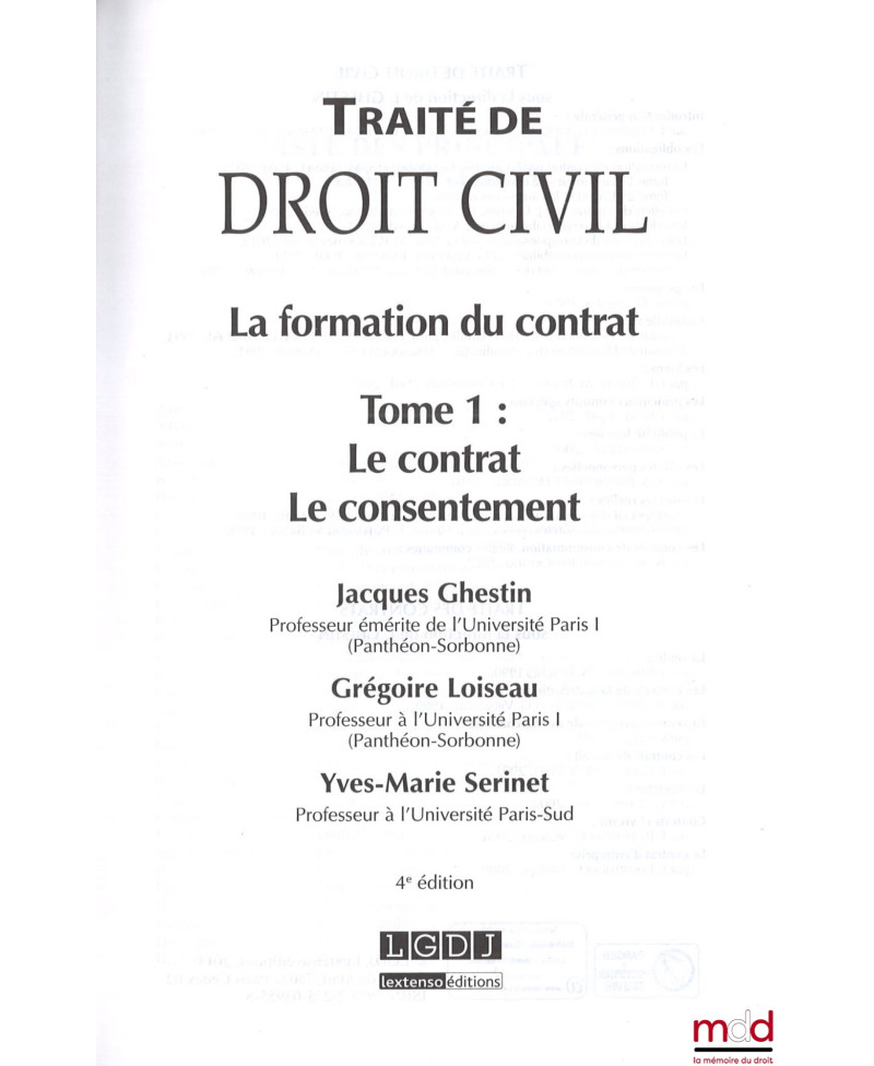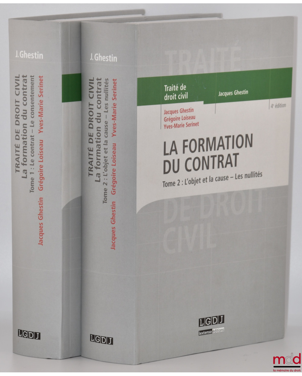 TRAITÉ DE DROIT CIVIL, sous la direction de Jacques Ghestin :– LA FORMATION DU CONTRAT, t. I : Le contrat - le consentement, (4e éd., 2013) ;– LA FORMATION DU CONTRAT, t. II : L’objet et la cause - les nullités, (4e éd., 2013).