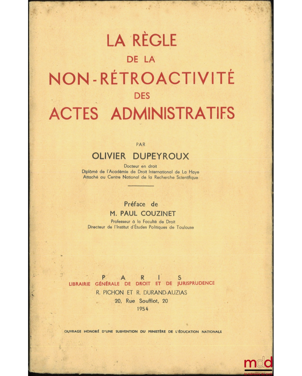 LA RÈGLE DE LA NON-RÉTROACTIVITÉ DES ACTES ADMINISTRATIFS, Préface de Paul Couzinet