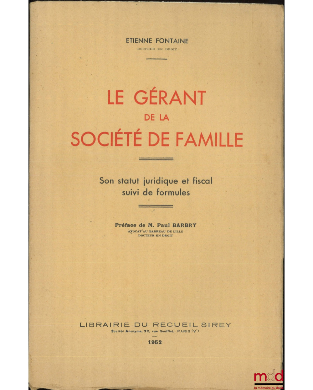 LE GÉRANT DE LA SOCIÉTÉ DE FAMILLE, Son statut juridique et fiscal suivi de formules, Préface de M. Paul Barbry