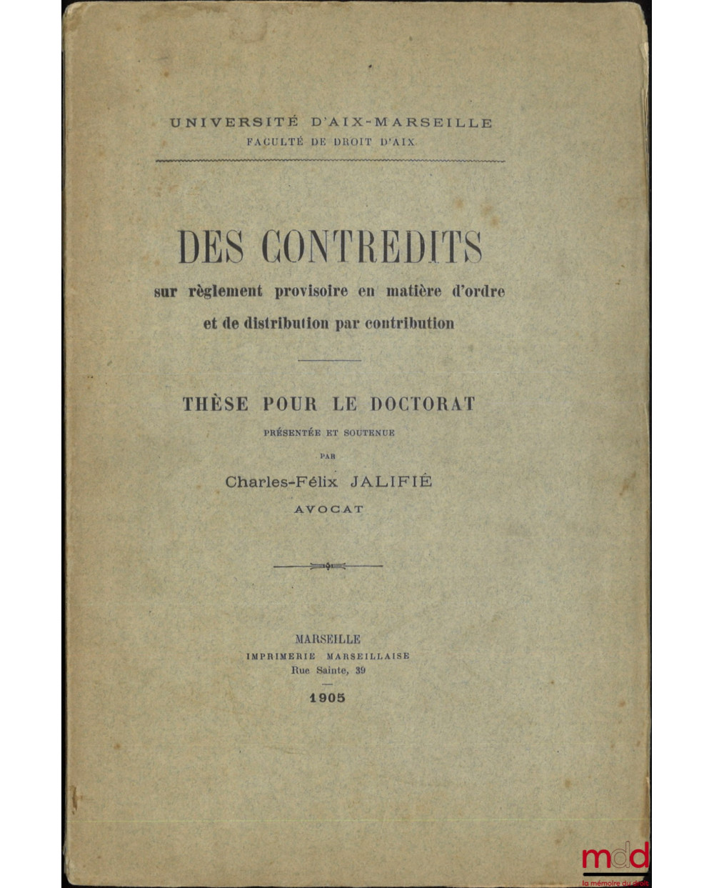 DES CONTREDITS sur règlement provisoire en matière d’ordre et de distribution par contribution, Thèse, Université d’Aix-Marseille
