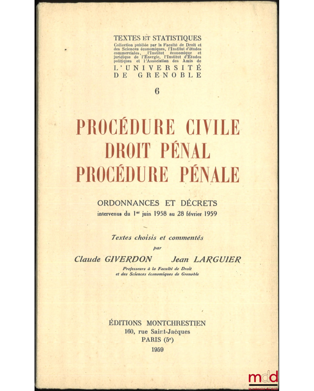 PROCÉDURE CIVILE, DROIT PÉNAL, PROCÉDURE PÉNAL, Ordonnances et décrets intervenus du 1er juin 1958 au 28 février 1959, Textes choisis et commentés par Claude Giverdon et Jean Larguier