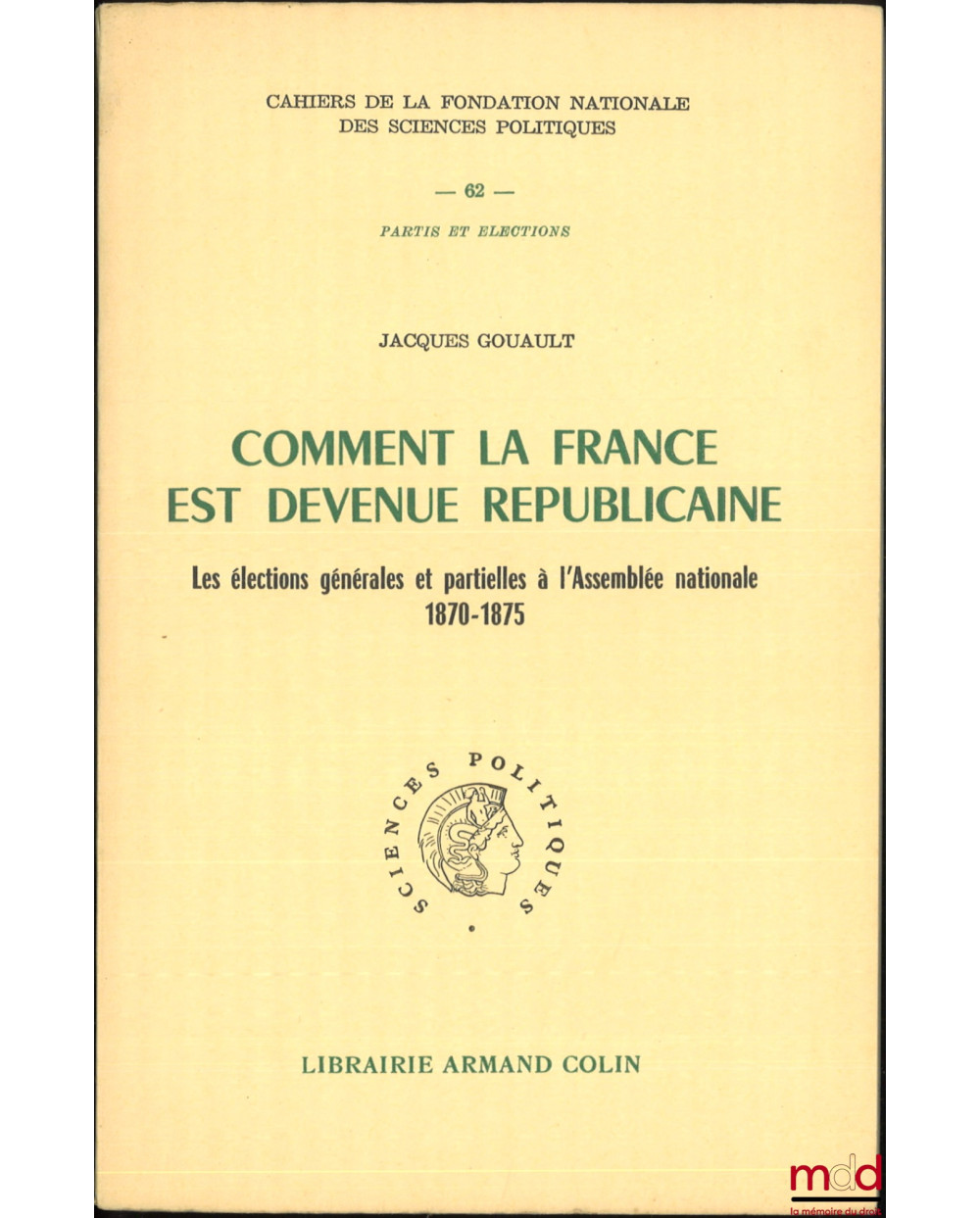 COMMENT LA FRANCE EST DEVENUE RÉPUBLICAINE, Les élections générales et partielles à l’Assemblée nationale 1870-1875, Préface de François Goguel, Cahiers de la Fondation Nationale des Sciences Politiques, n° 62