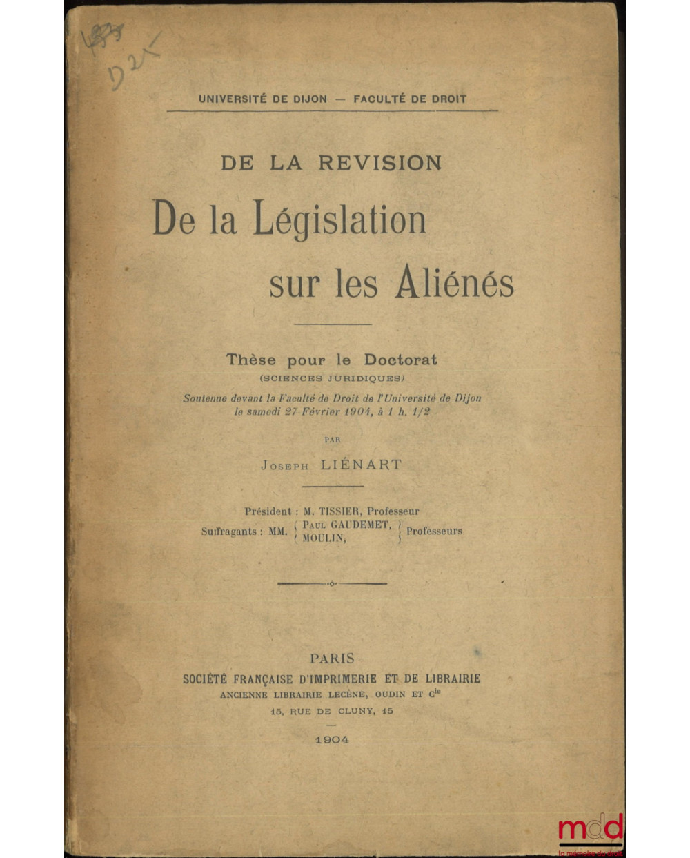 DE LA RÉVISION DE LA LÉGISLATION SUR LES ALIÉNÉS, Thèse (Président : M. Tissier ; Suffragants : Paul Gaudemet, Moulin), Université de Dijon - Faculté de droit