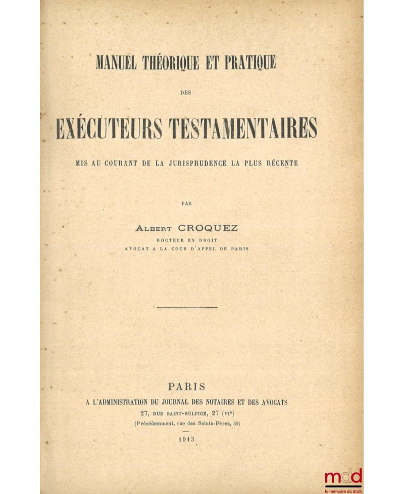 MANUEL THÉORIQUE ET PRATIQUE DES EXÉCUTEURS TESTAMENTAIRES, Mis au courant de la jurisprudence la plus récente