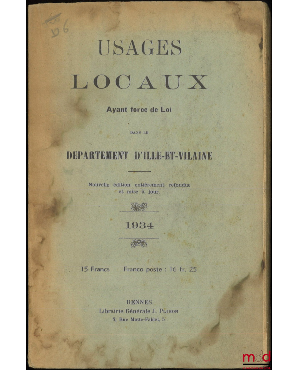 USAGES LOCAUX AYANT FORCE DE LOI DANS LE DÉPARTEMENT D’ILLE-ET-VILAINE, Nouvelle éd. entièrement refondue et mise à jour.