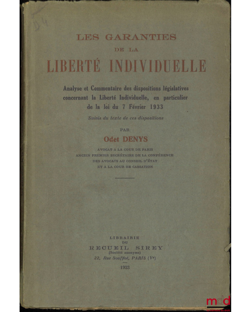 LES GARANTIES DE LA LIBERTÉ INDIVIDUELLE, Analyse et Commentaire des dispositions législatives concernant la Liberté Individuelle en particulier de la loi du 7 février 1933, Suivis du texte de ces dispositions