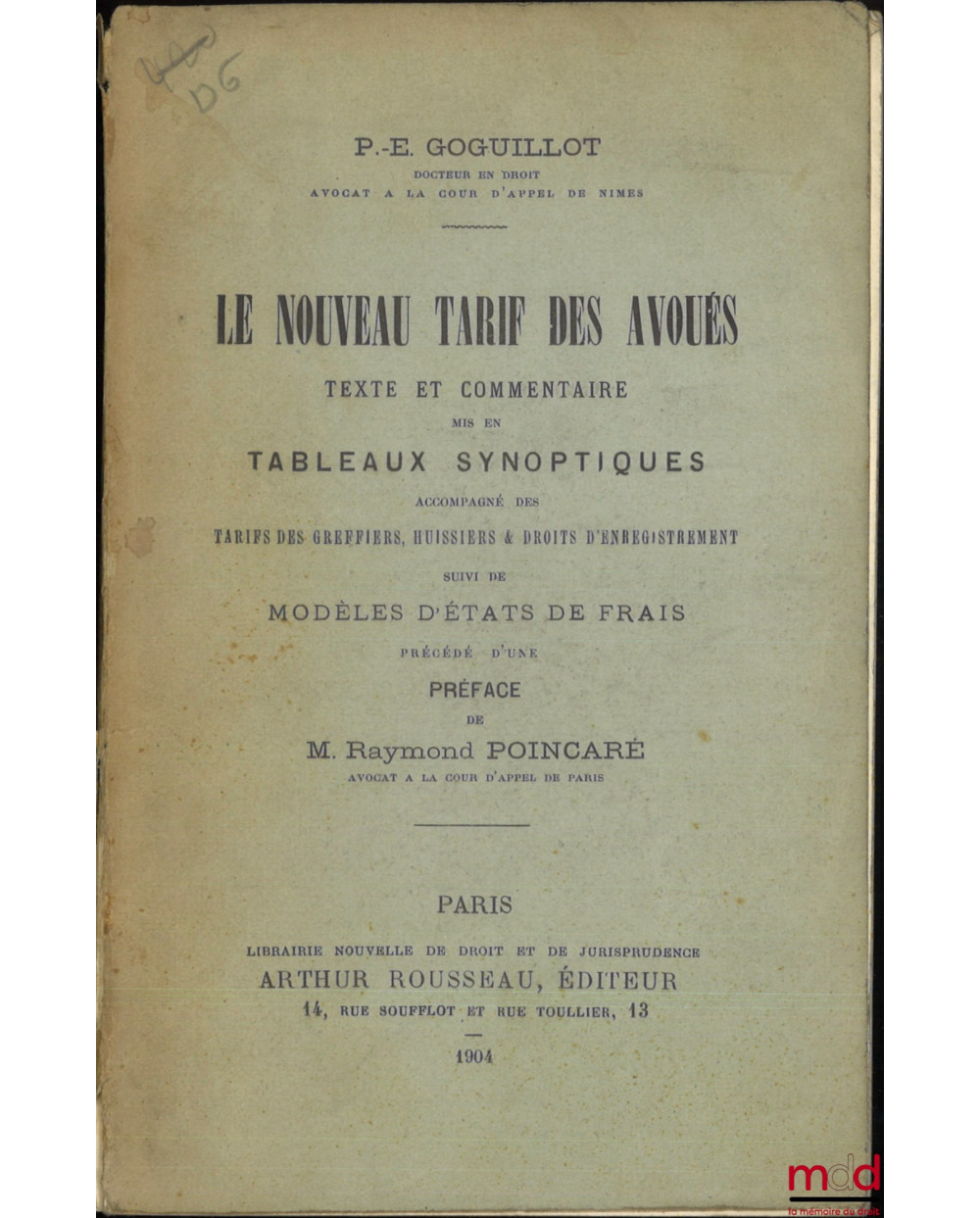 LE NOUVEAU TARIF DES AVOUÉS, Texte et commentaire mis en tableaux synoptiques accompagné des tarifs des greffiers, huissiers & droits d’enregistrement, Suivi de modèles d’états de frais, Précédé d’une préface de Raymond Poincaré